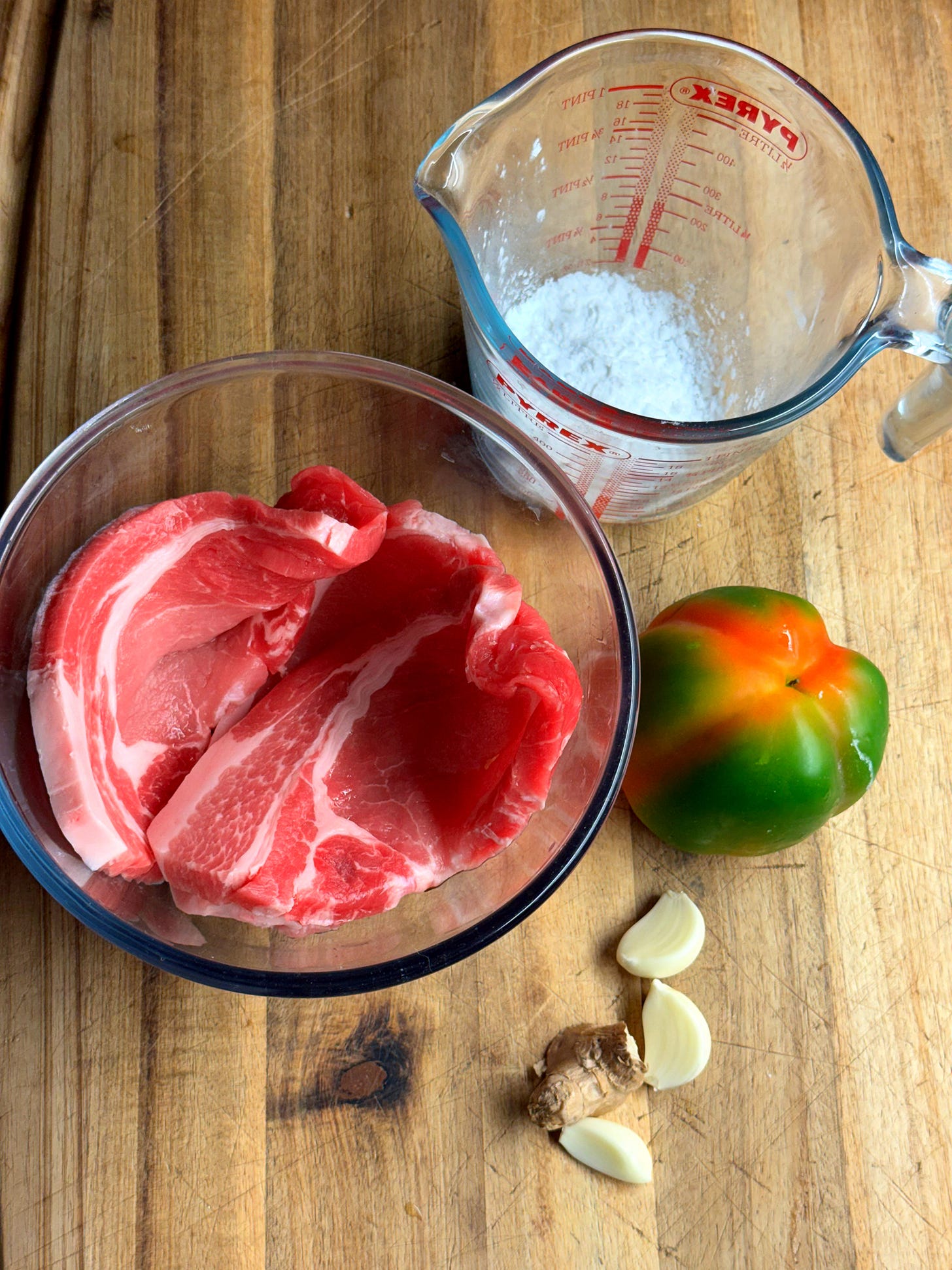 Korea is home to many Chinese immigrants, particularly from Shandong province. With them, they brought the classic Chinese remedy for rich meats and seafood: a sweet-and-sour sauce, or ‘tang cu’ (糖醋) - literally ‘sweet-sour’. The secret to making an excellent sweet-and-sour sauce is making a caramel at the start, which creates a rich, sophisticated sweet and sour sauce that doesn’t feel too sweet. With that, a crispy pork fritter which is a modern, weeknight-friendly answer to old-fashioned slow-roast meats. For the more health-conscious Koreans, the true lure of this pork fritter is that it has the crispiness of pork belly but uses boneless, lean pork chops. Together with the sauce, this dish is known as ‘tangsuyuk’. The sweet-and-sour sauce can be used as a dipping sauce or poured all over the fritter at the table; Koreans love to argue over either! Let’s go!