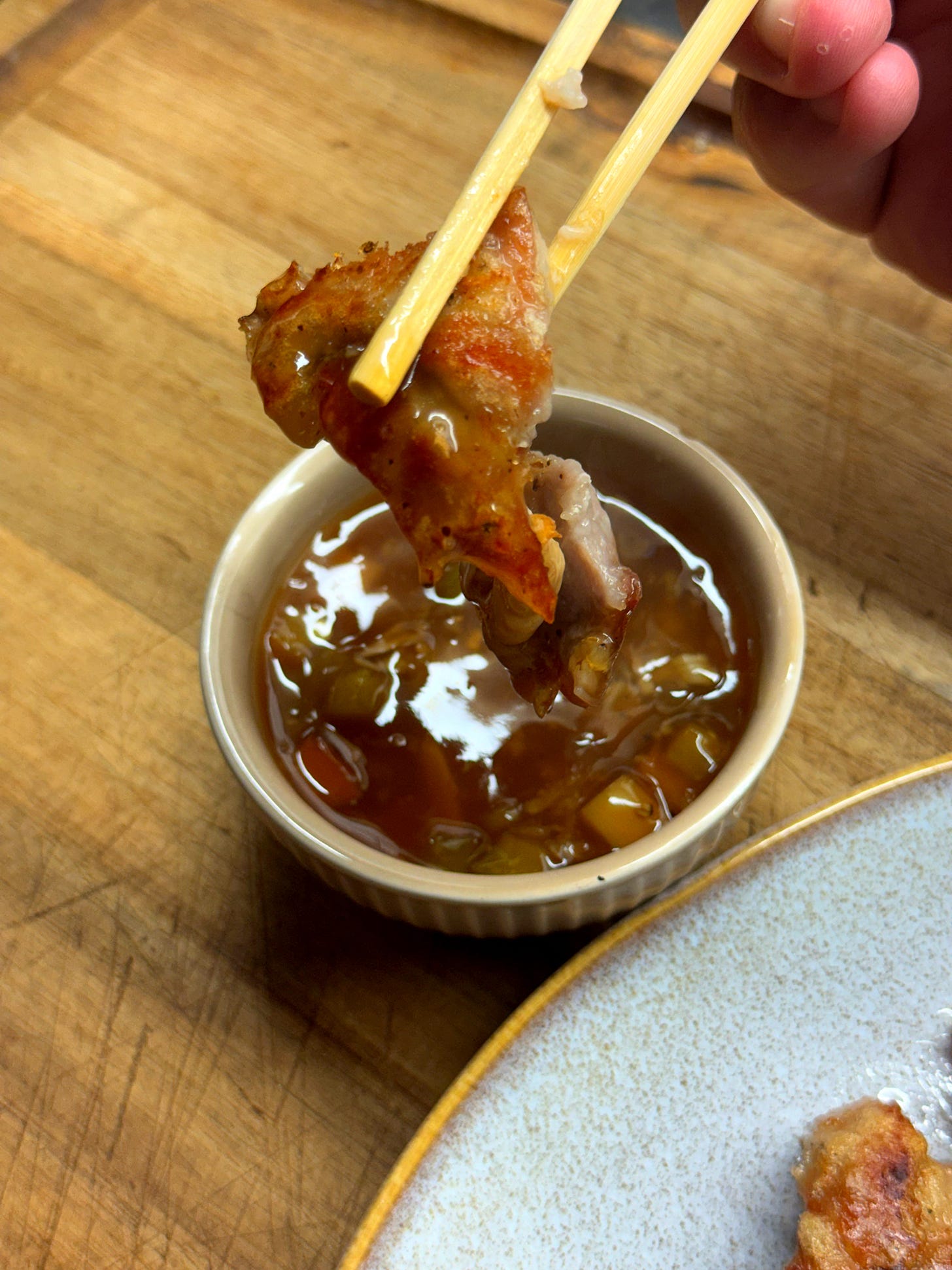 A Korean-Chinese classic. This crispy, pan-fried fritter features juicy nuggets of meat, served with a sweet-and-sour pepper relish.