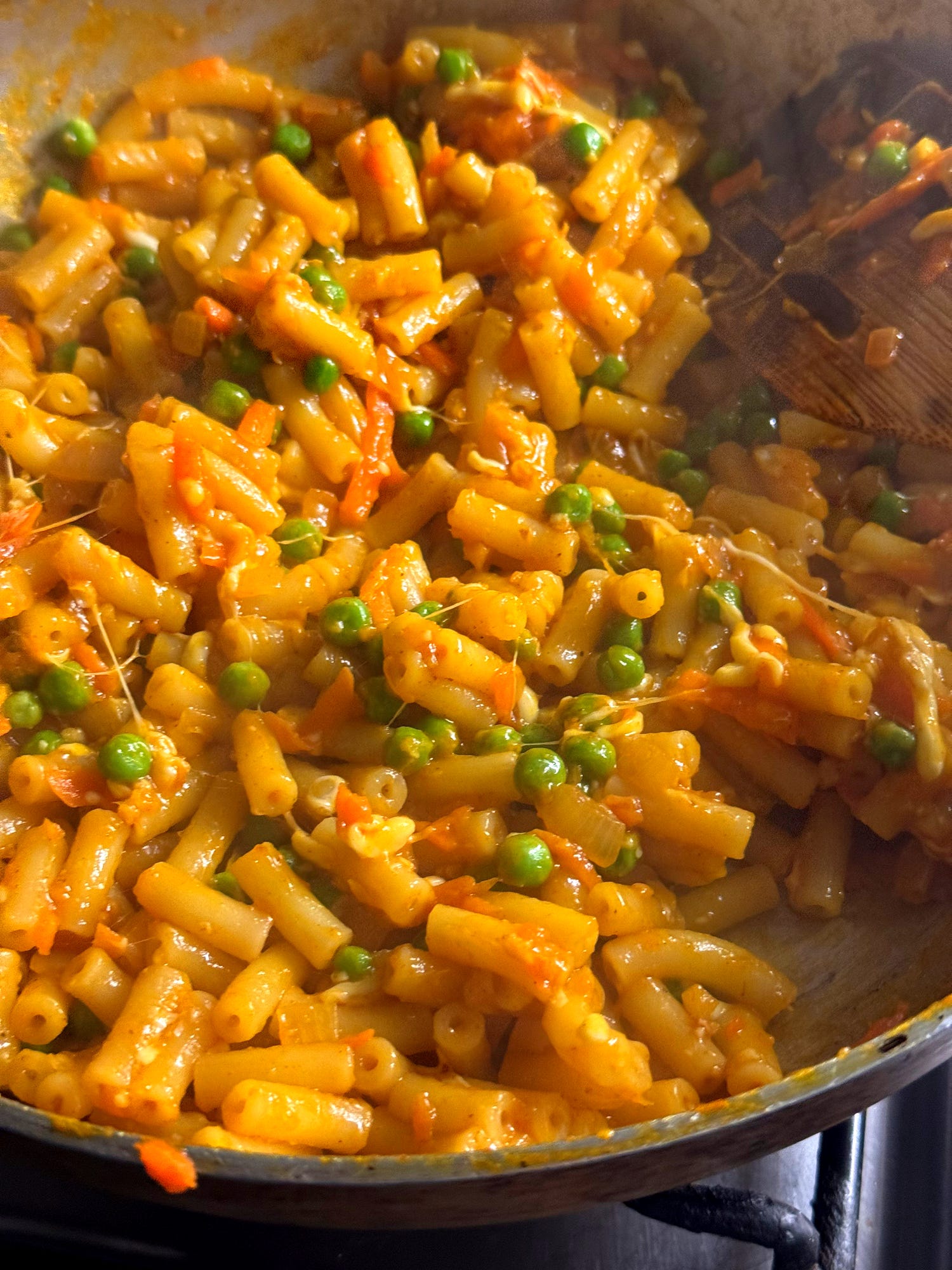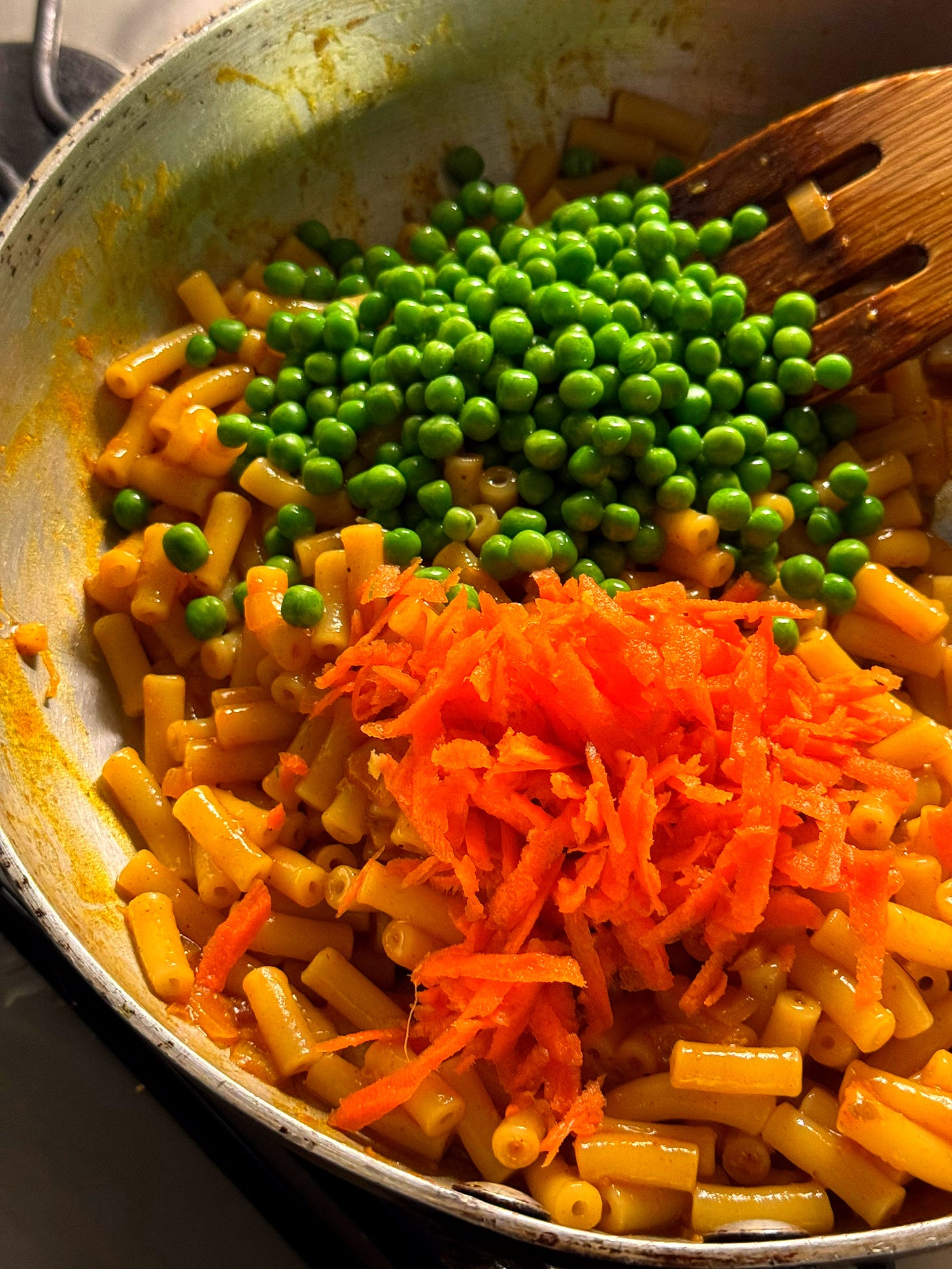 Add all of the cooked, drained pasta to the pan and toss until coated in the ingredients. Reduce the heat to low and add the grated carrot and frozen peas. Toss until the vegetables are distributed in the pasta and warmed through.