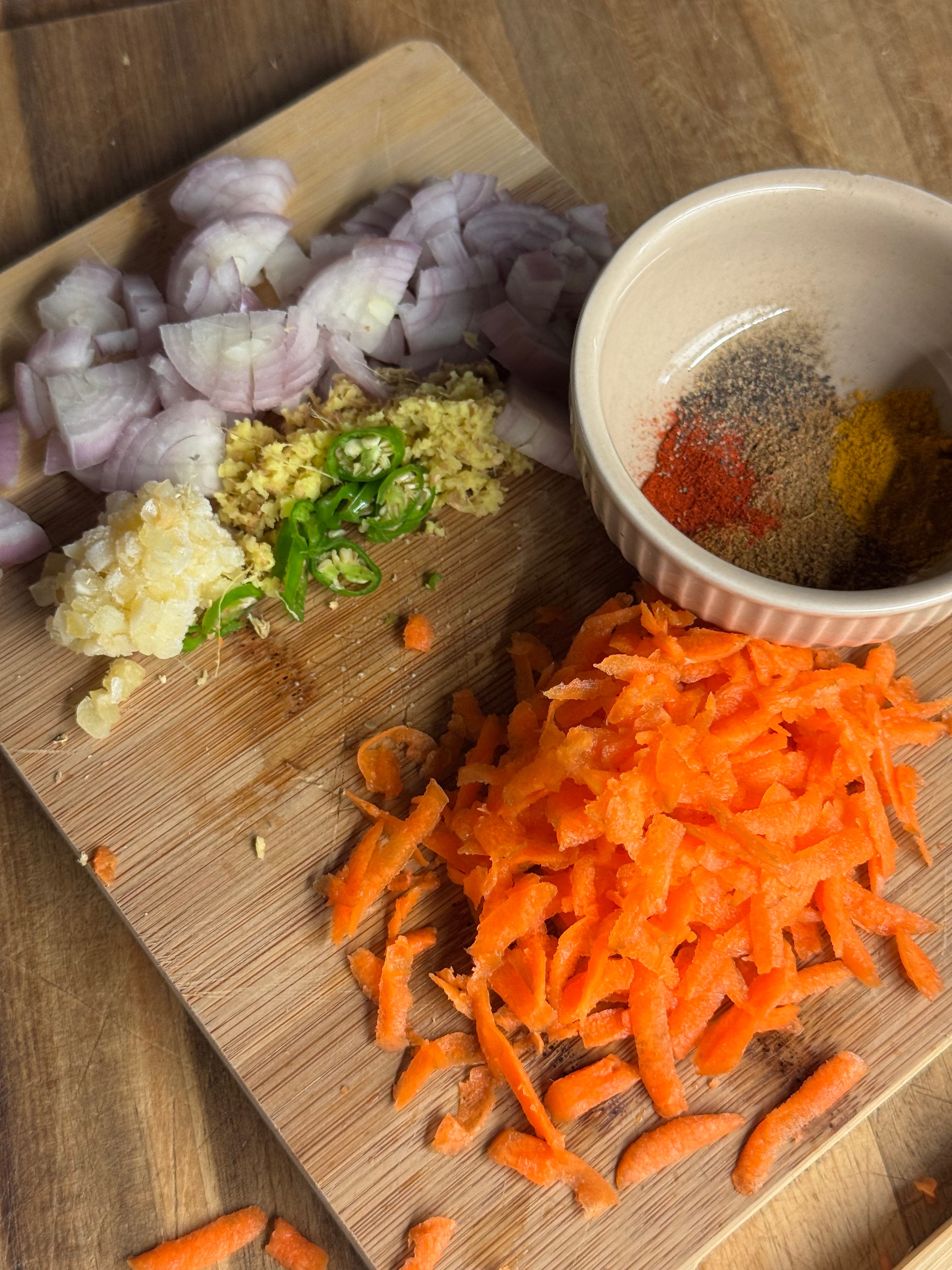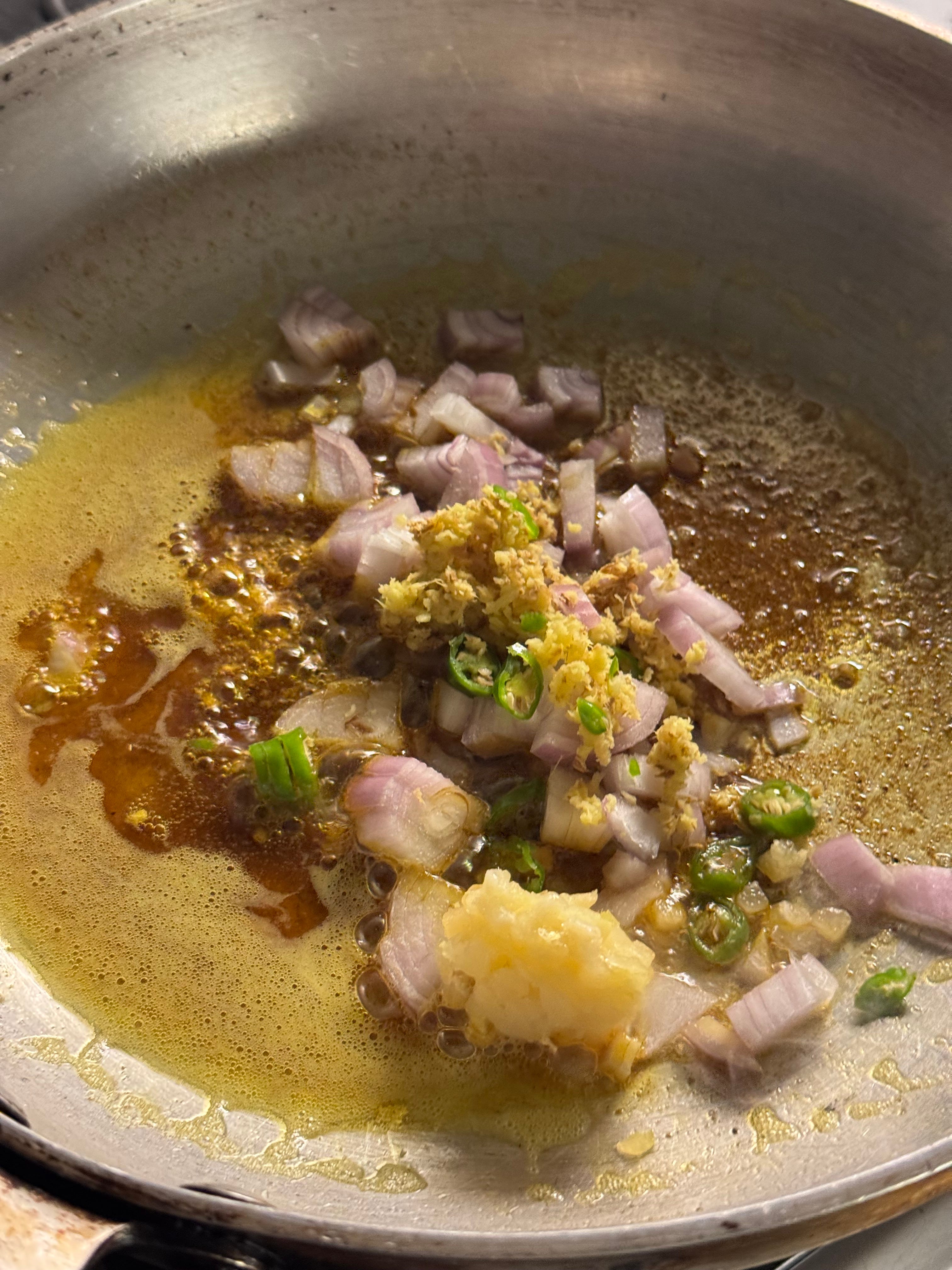 Add the diced shallot, 2x cloves of diced garlic, grated ginger and 1-2 sliced green chillies. Fry this mixture for 1 minute at medium heat until softened and fragrant.