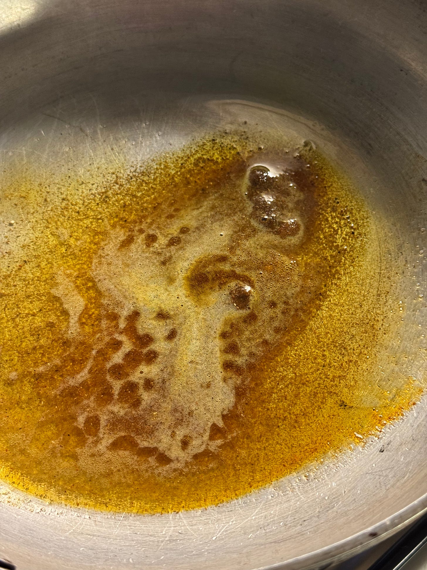 Place a wok or frying pan onto medium-low heat. When heated, add 2 tablespoons of oil or ghee. Immediately add the 1 tsp cumin, 1/2 tsp ground coriander, 1/2 tsp chilli powder and 1/2 tsp turmeric. Fry the spices briefly in the oil until toasted and fragrant, about 10-20 seconds.