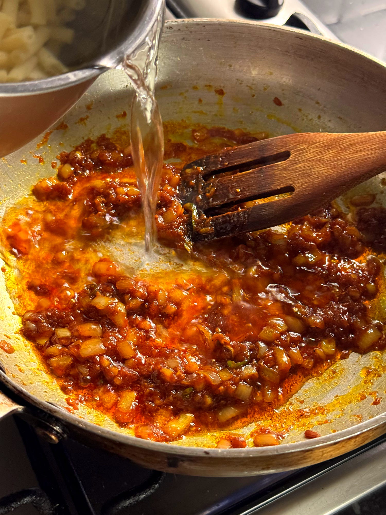 Add the 100ml of water (the pasta cooking water is great). Mix until combined, and bring to a boil amount of sauce. Season the sauce with 1/2 tsp salt.
