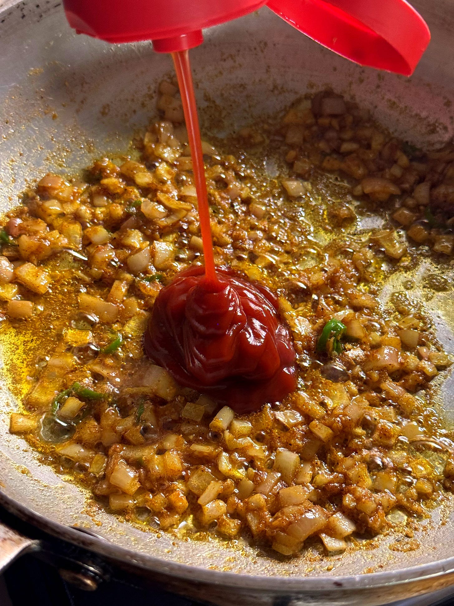 Add the 3 tablespoons of tomato ketchup and fry the mixture until it is reduced and rich, about 2 minutes.