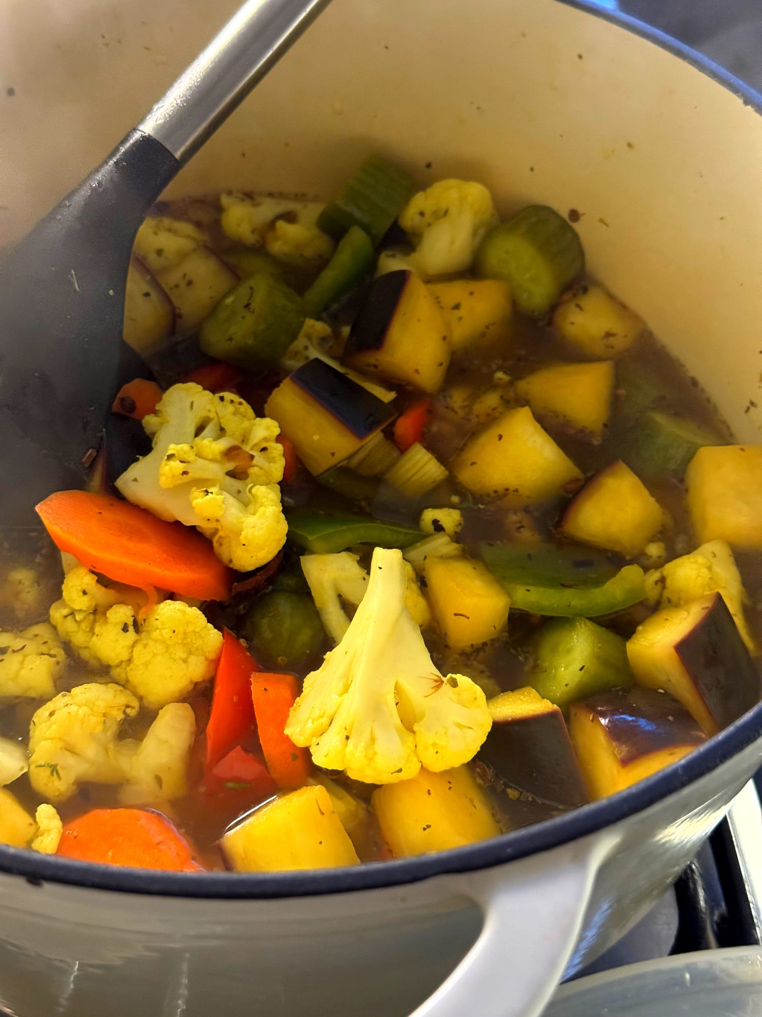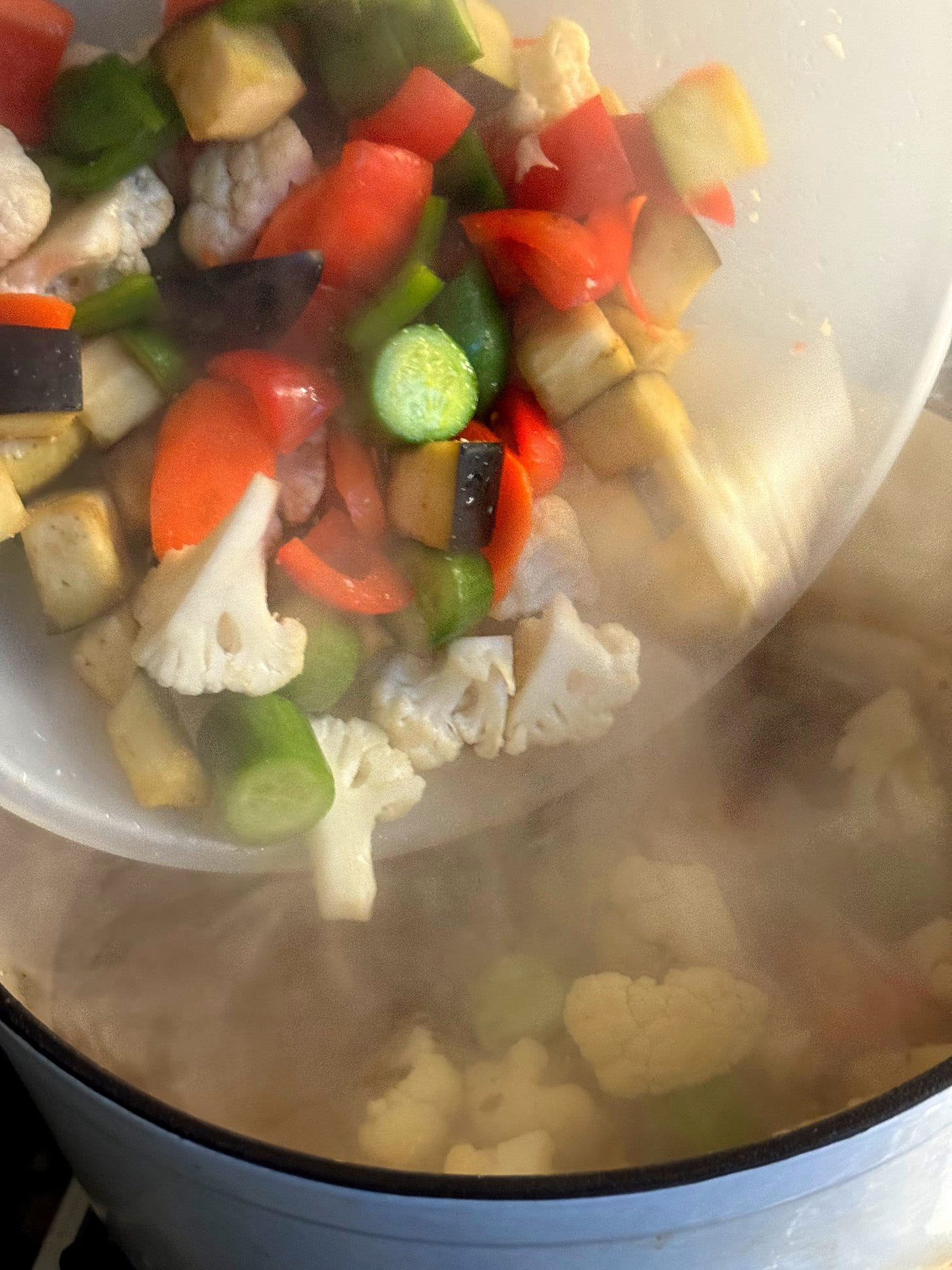 Add the rinsed vegetables and stir until they are coated in brine. Allow the brine to come up to a steady boil then immediately turn off the heat.