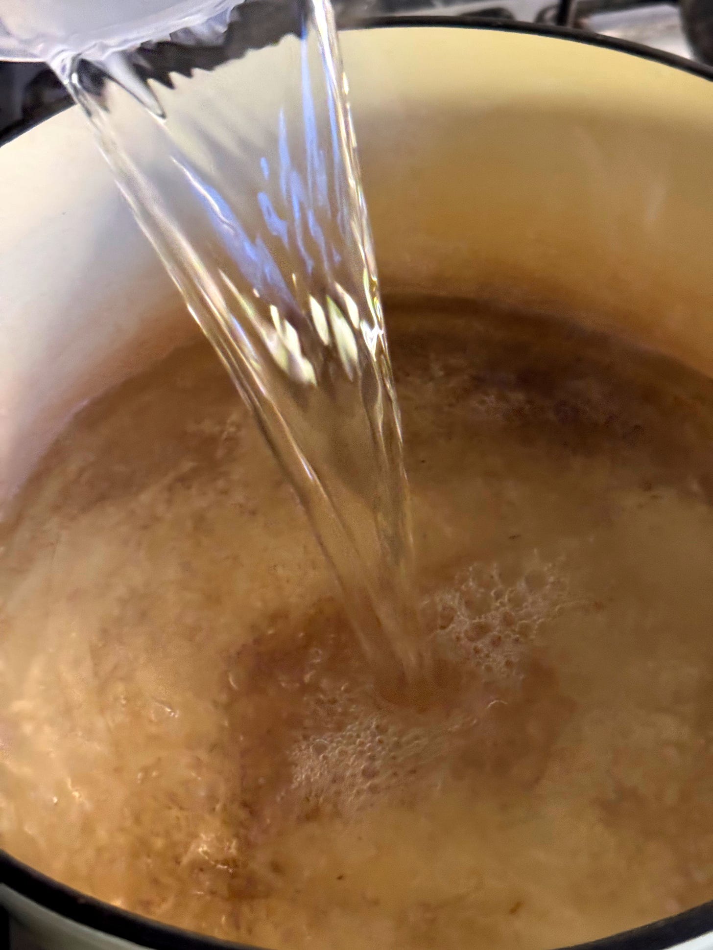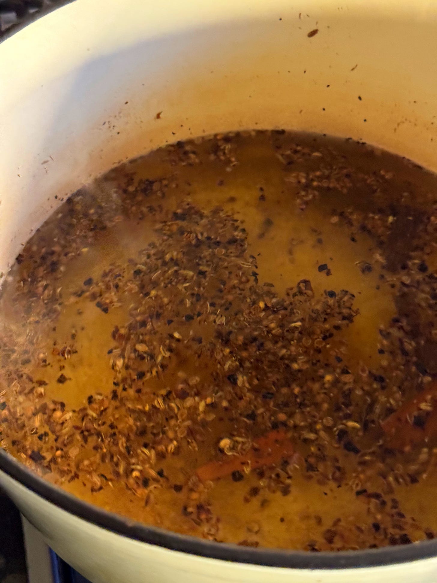 Once boiling, add the toasted spices to the brine along with the 1 tablespoon of ground turmeric and 2 tsps of dried herbs. Stir until distributed.