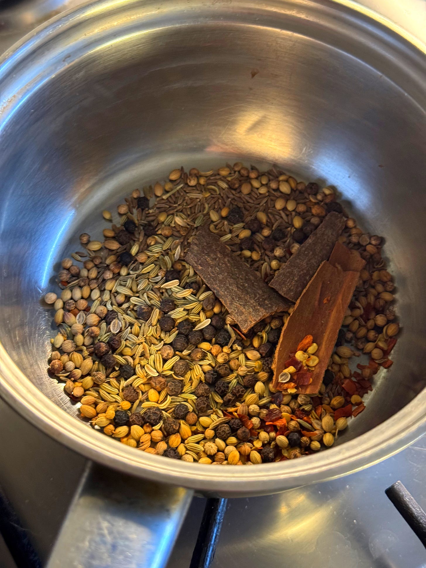 In the meantime, toast the spices. Place a small pan onto medium-low heat. Add the 2 tsps black peppercorns, 2 tsps cumin seeds, 2 tsps fennel seeds, 2 tsps coriander seeds and 1 cinnamon stick. No oil is needed. Gently toast the spices until fragrant, about 2-3 minutes, then tip them into a bowl and set aside.