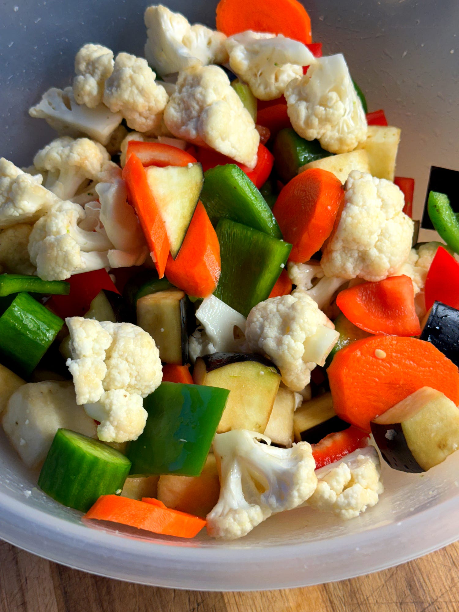 First, let’s take care of the chopping. Wash and chop all of the vegetables into roughly even-sized pieces. Slice the garlic and chillies into smaller pieces and combine with the other vegetables. Place them into a large mixing bowl and scatter over 2 tsps of fine salt. Toss the vegetables until they are well-coated in salt and leave them at room temperature for 30 minutes. This salting process will help keep the vegetables crunchy.