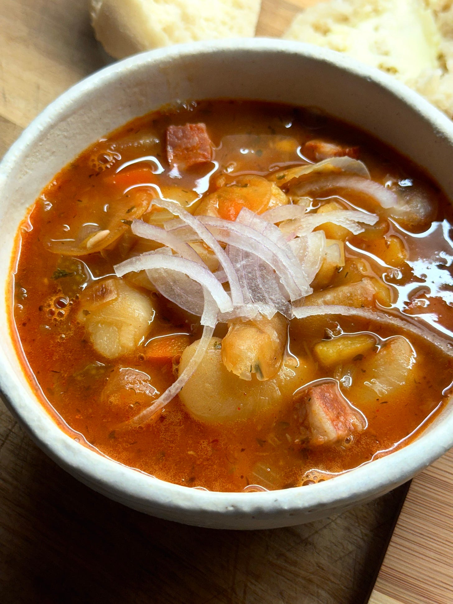 One of Europe’s most modest cuisines, Romanian food offers a unique intersection of classic Eastern European and Mediterranean styles, with a hint of the East. Something shared by all points of this trifecta is soup - known as ‘ciorbă’ in Romania. This particular soup marries various culinary styles that will feel intriguingly familiar to a lot of people. As a bean soup, ‘ciorbă de fasole’ uses any dry white beans - cannelini, lima beans, butter beans - which we’ll soak and cook from scratch to make a creamy bean ‘stock’. I’ll include recipe notes for canned/jarred beans too. What makes this soup distinct really distinct though: the raw onions. Romanians often enjoy ciorbă with a frizz of raw, sliced onions on top. I highly recommend trying it - it’s adds pure electricity to a winter’s soup. You can also make this soup meat free, as it would be eaten during Lent. Simply remove the cured meats and replace with dried mushrooms and a vegetable stock. Let’s go!