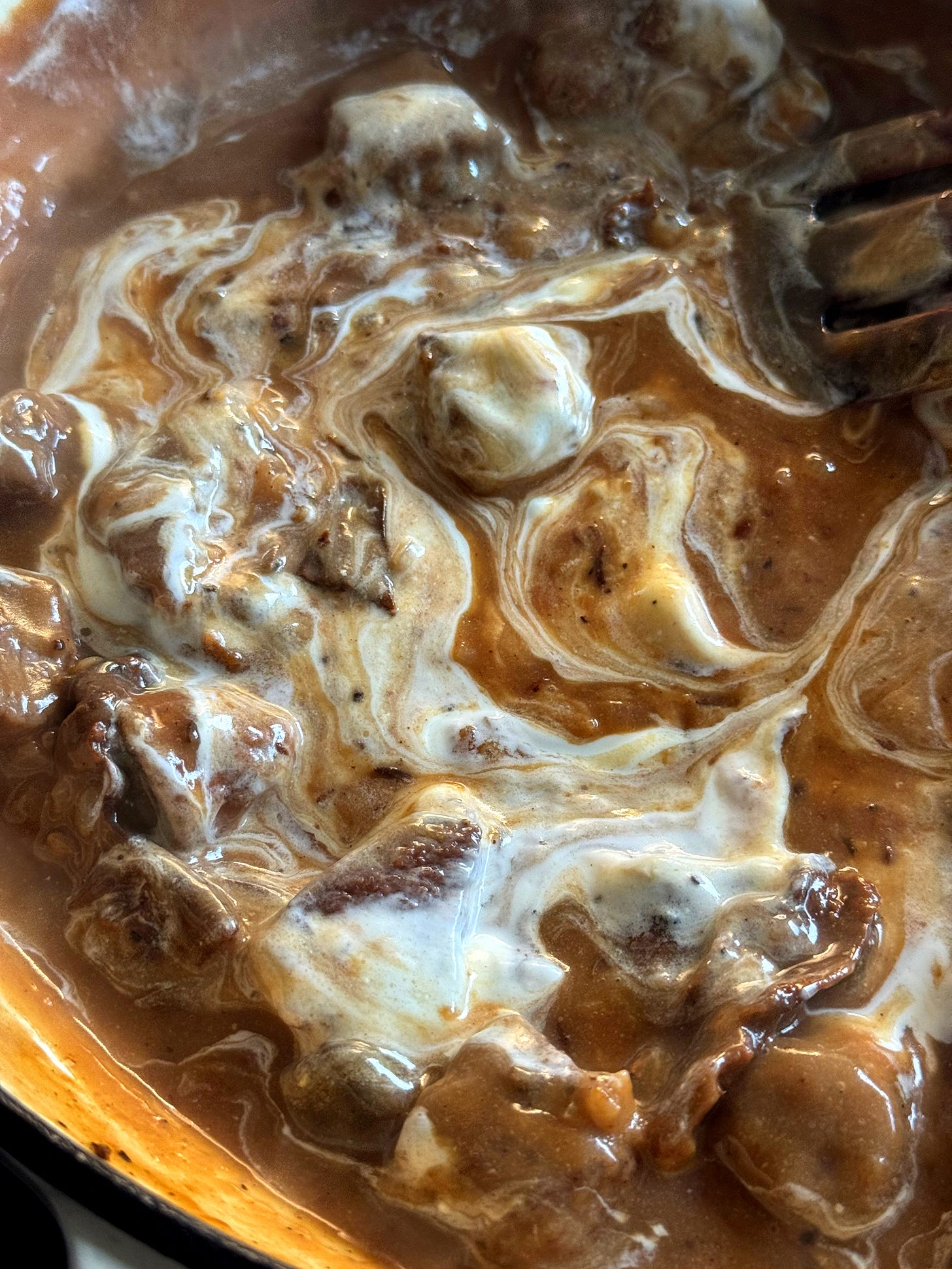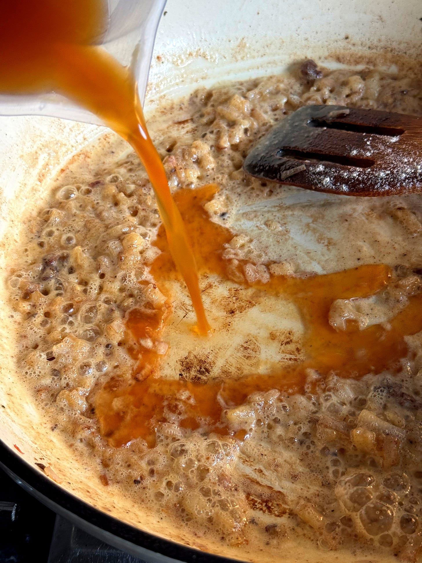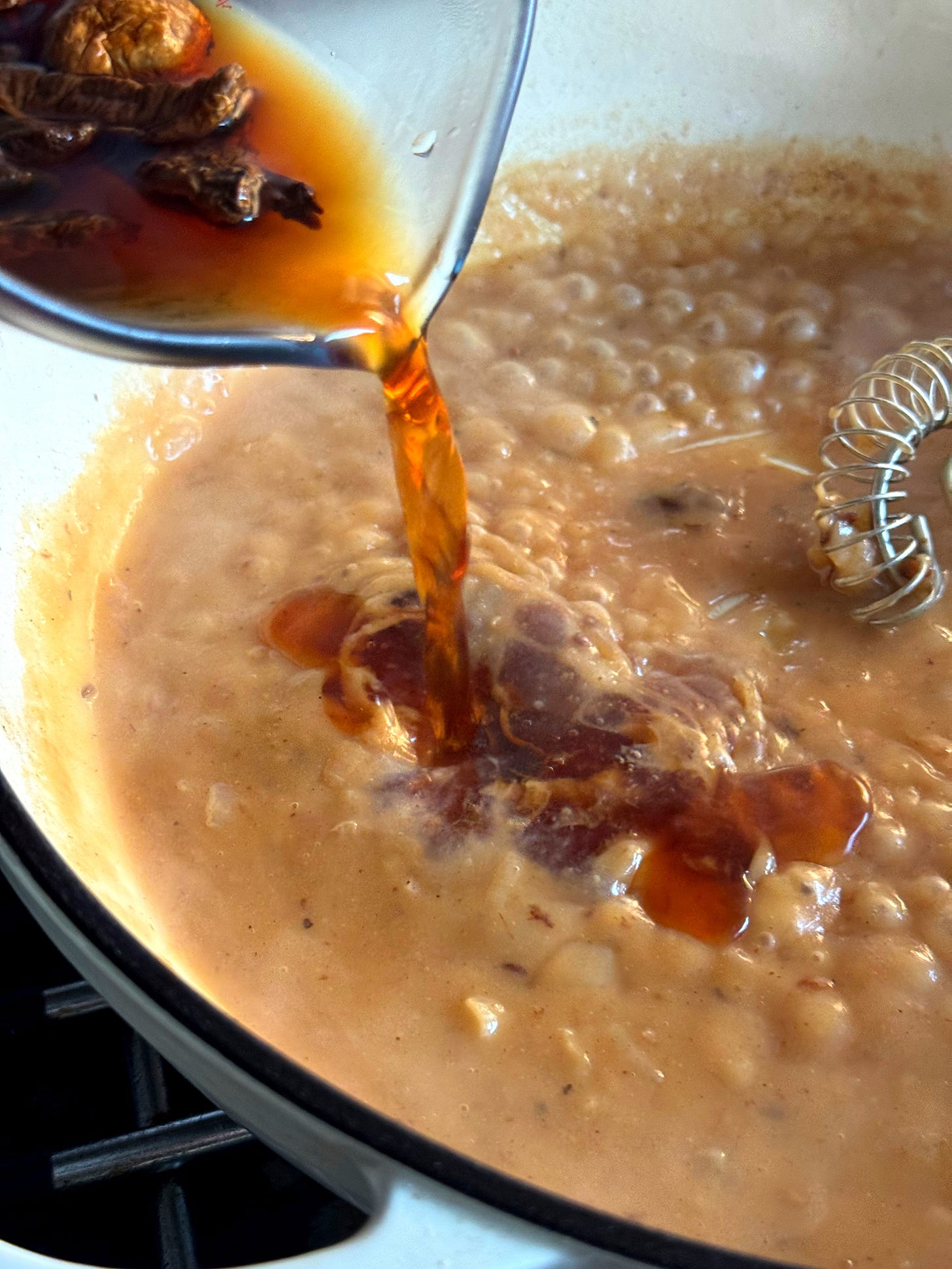 Add the dried mushrooms and their soaking liquid and stir into the sauce. Once it returns to a steady boil, add the reserved browned beef from earlier.