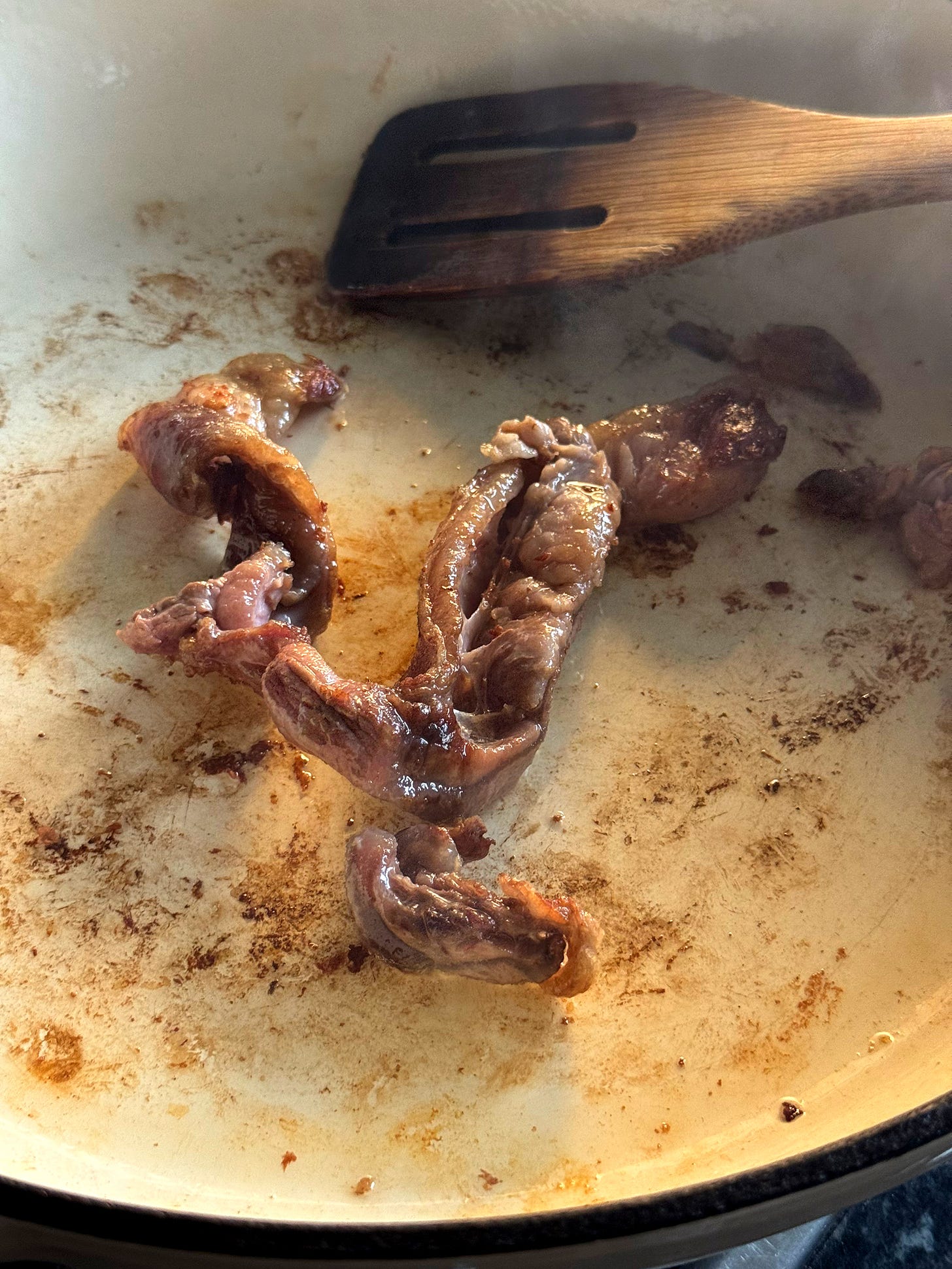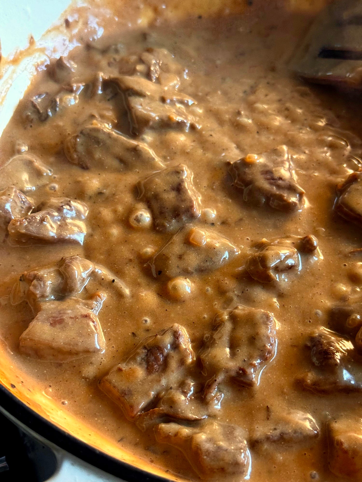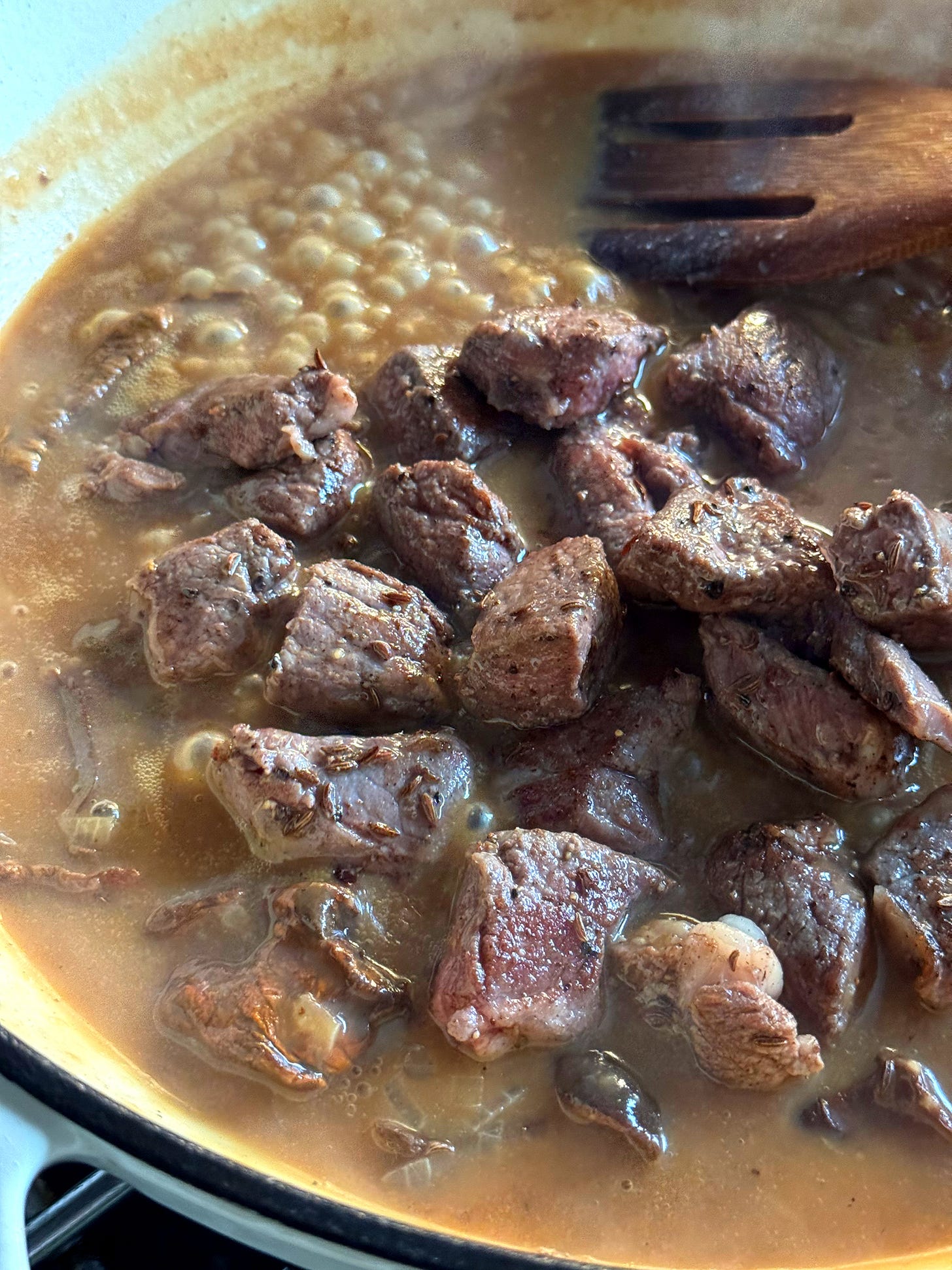 Add the dried mushrooms and their soaking liquid and stir into the sauce. Once it returns to a steady boil, add the reserved browned beef from earlier.