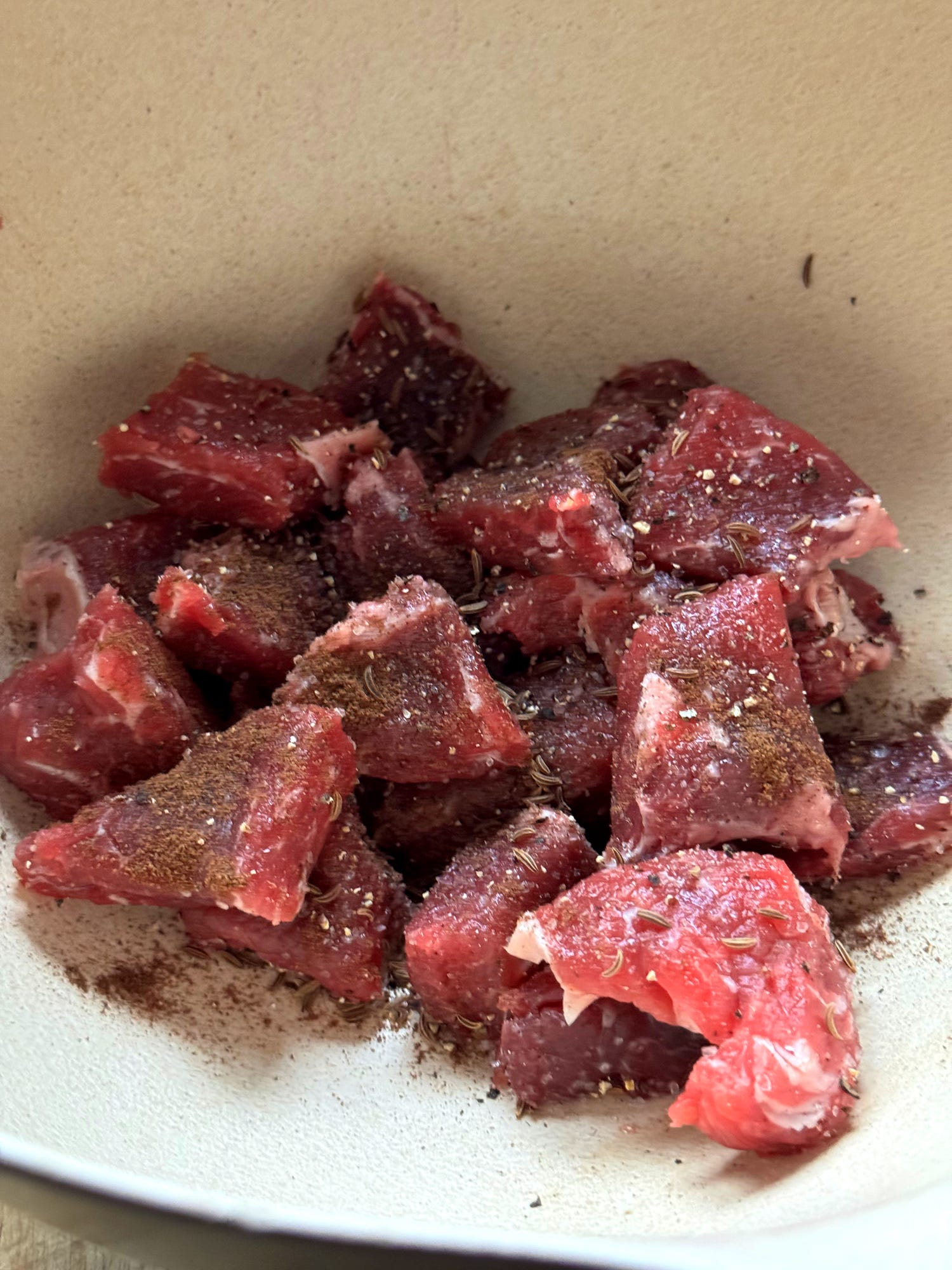 First, let’s prepare the beef. Cut away any hard pieces of fat from the 300g beef and keep it aside. Dice the lean beef and combine it in a mixing bowl with 1/2 tsp salt, 1/2 tsp black pepper, 1 tsp caraway seeds and 1/2 tsp allspice. Set this aside.