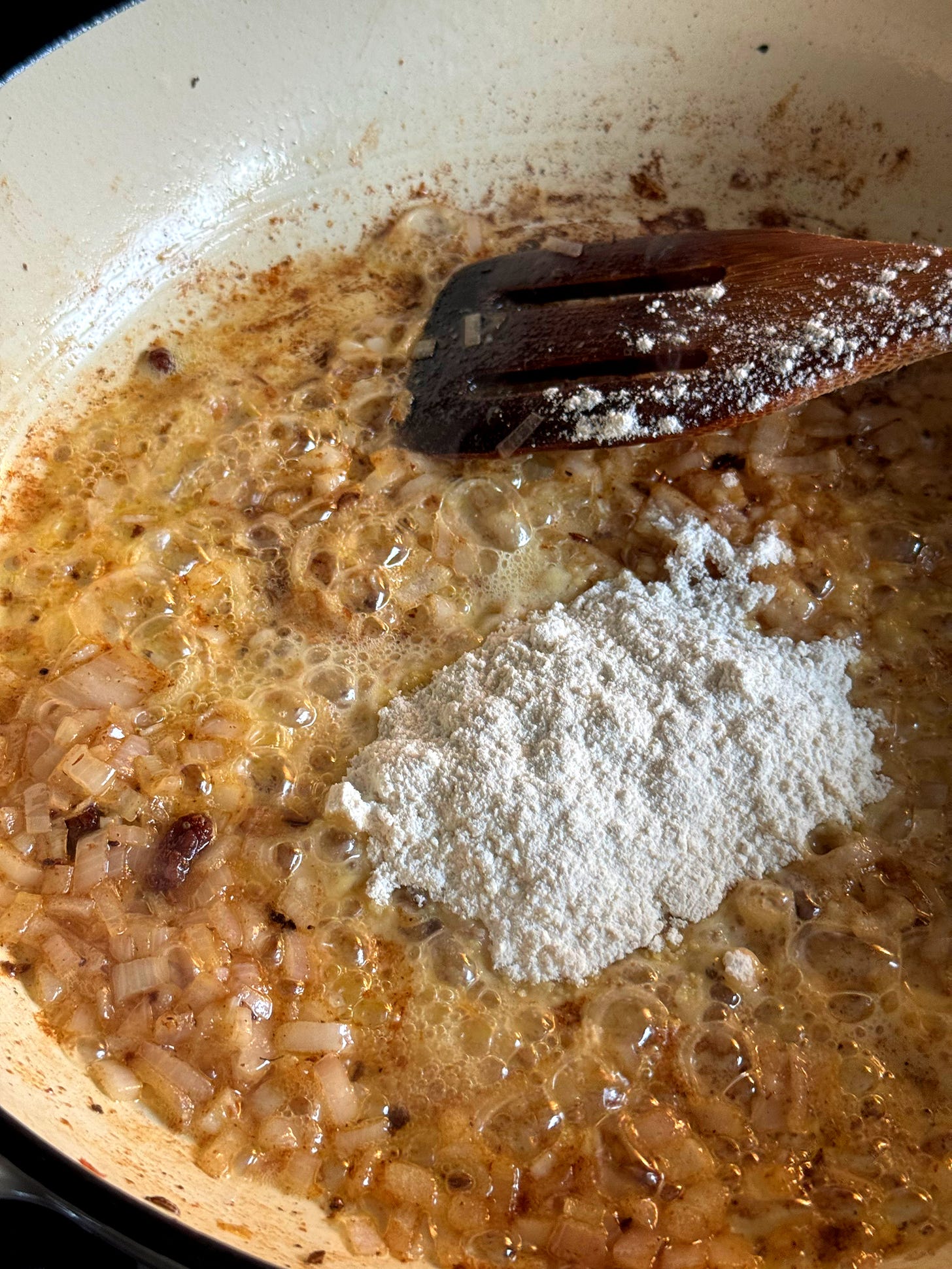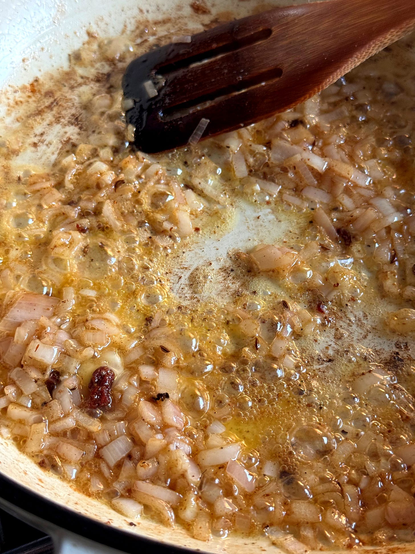 Reduce the heat to low. Add 50g of butter followed by 1x diced shallot. If using fresh mushrooms, add these now also. Gently fry the ingredients until softened, about 2-3 minutes, scraping up any browned bits from the bottom of the pan as you go.