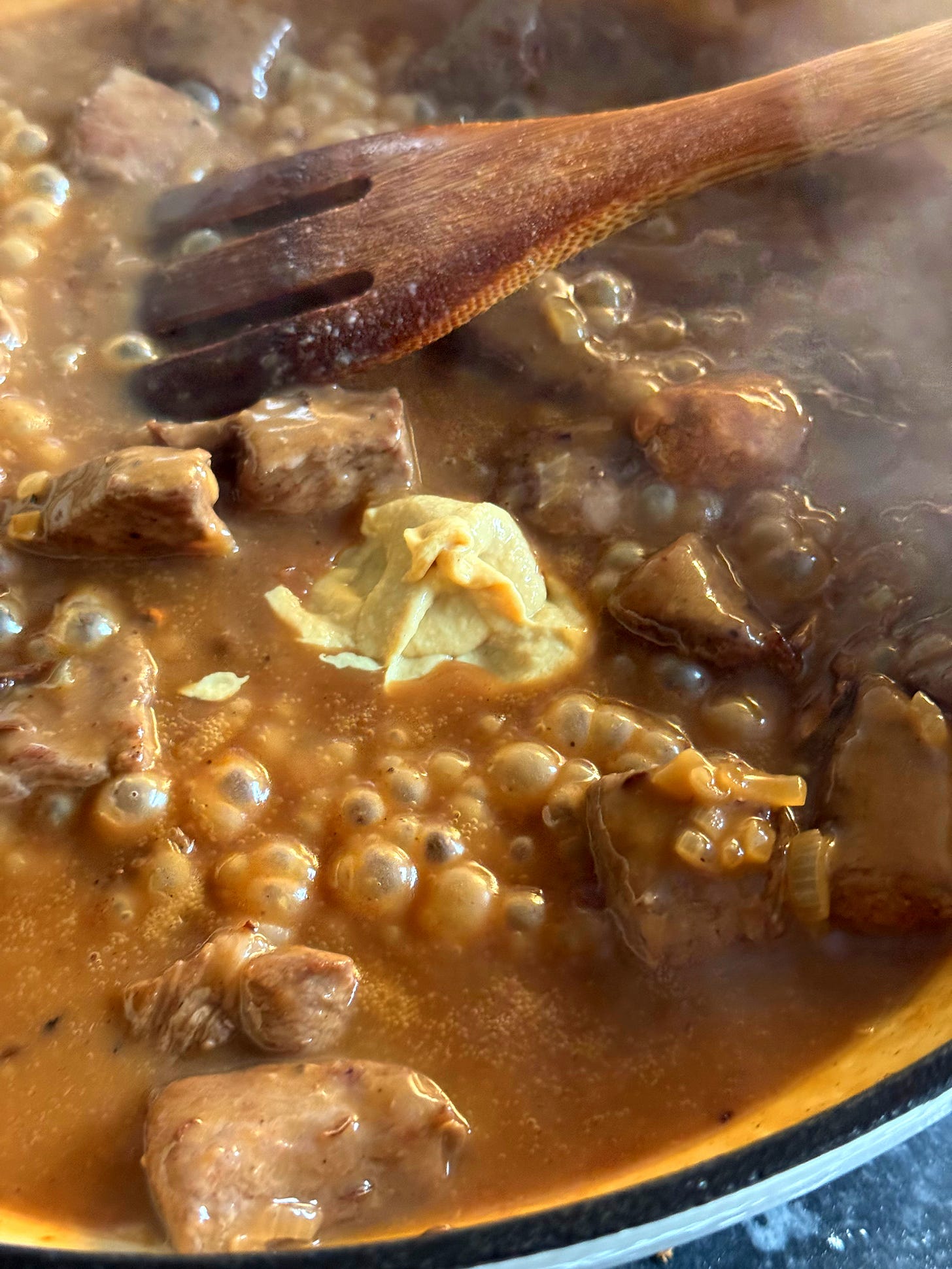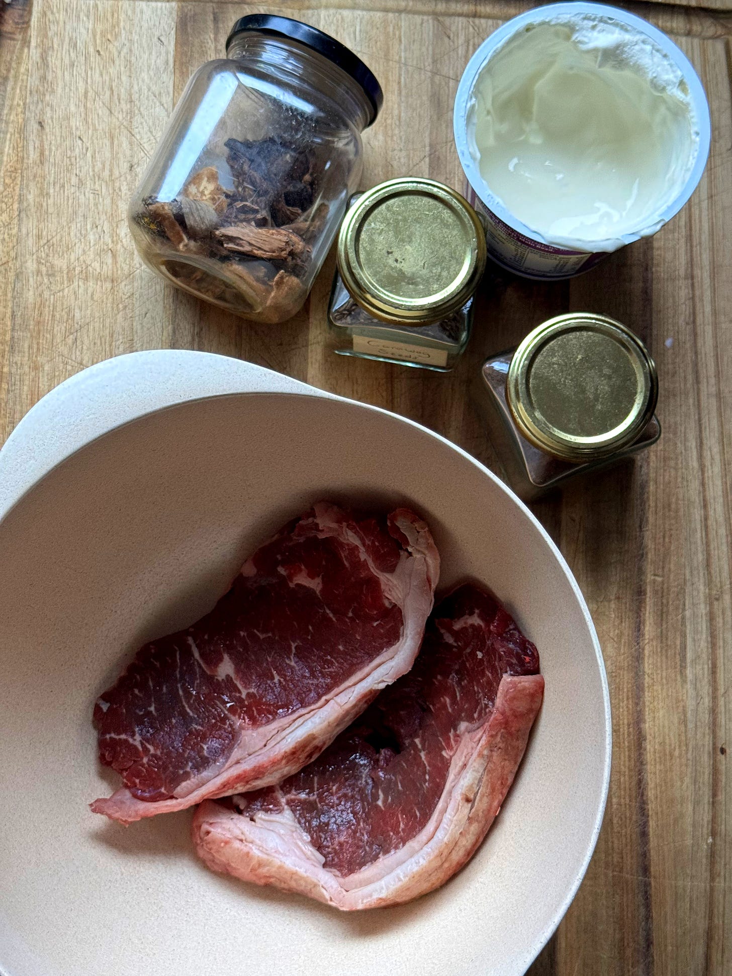Stroganoff has been one of the most widespread, popular dishes around Europe for the last century. You’ll find versions of this dish throughout the former Soviet Empire nations, as well as Western Europe and even in Brazil! Stroganoff originated in Russia, where it was known as a luxury dish served to the wealthy Stroganov family in St. Petersburg. The dish famously used high-quality lean beef, the best soured cream and later evolved to contain white wine or cognac. This version however is a different story. Away from the gold-plated samovars and fabergé eggs of St Petersburg, this version of stroganoff is served at homes, diners and school canteens in Russia’s more remote, parsimonious regions. In the north of the country, Siberia has a reputation for long, brutal winters and very limited seasons for growing fresh produce. The Siberian palate evolved around meat and dairy for this reason, which forms their style of stroganoff. For this reason, the Siberian version often relies on dried mushrooms, not fresh, which actually offer a richer, more umami background to complement the beef. You’ll also taste some interesting earthy spices like allspice and caraway, echoes of the Turkic influence in remote Russia. Finally, the dish is tied together with creamy mustard and soured cream, which alleviates the richness with a refreshing tang. No bells and whistles, white wine or cognac. Just all heart. Let’s go!
