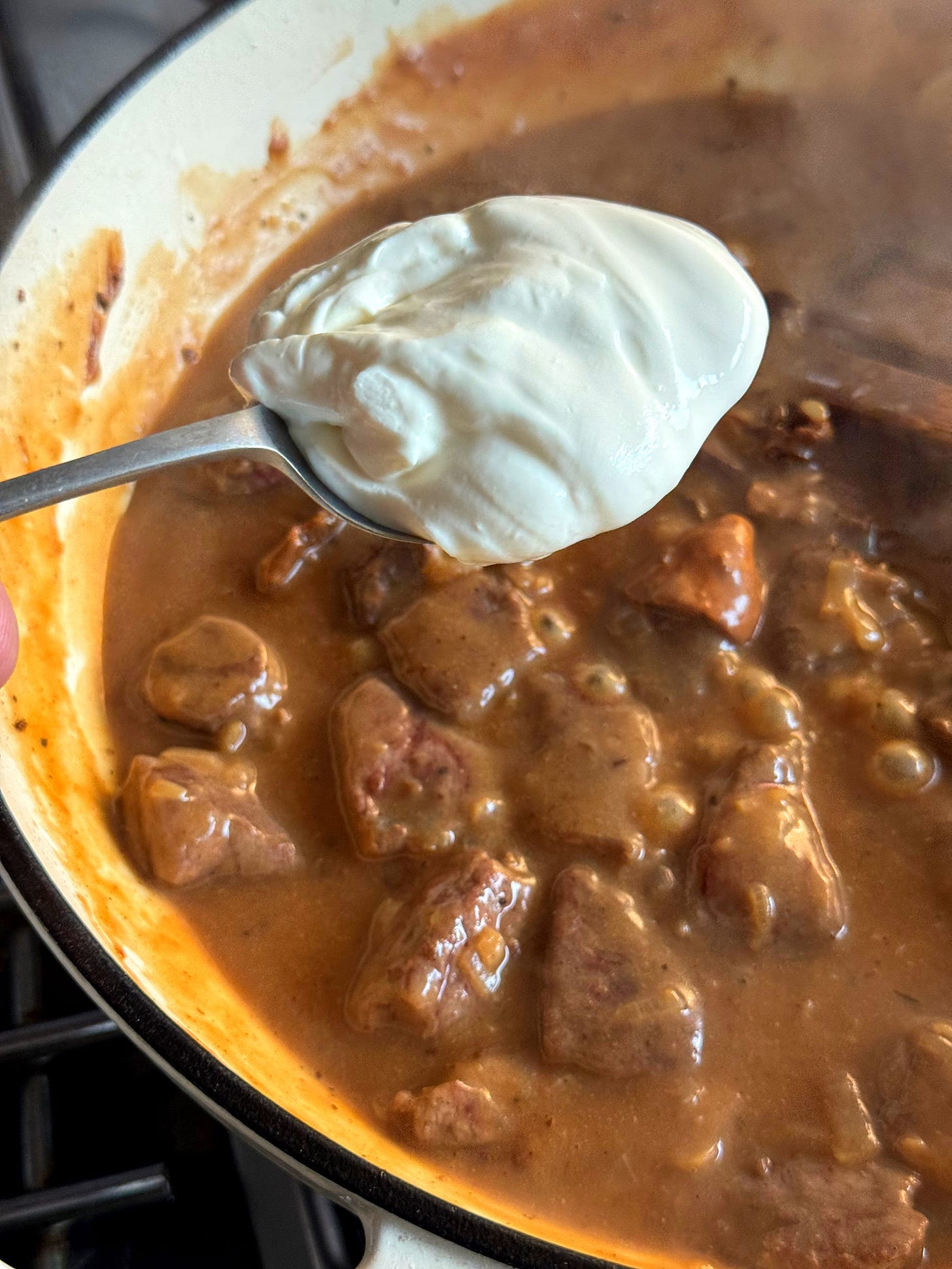 Add 2 tsps of Dijon mustard followed by 2-3 tablespoons of soured cream. Stir until well-combined and taste the sauce for seasoning. You may need to adjust it with some extra salt or pepper.