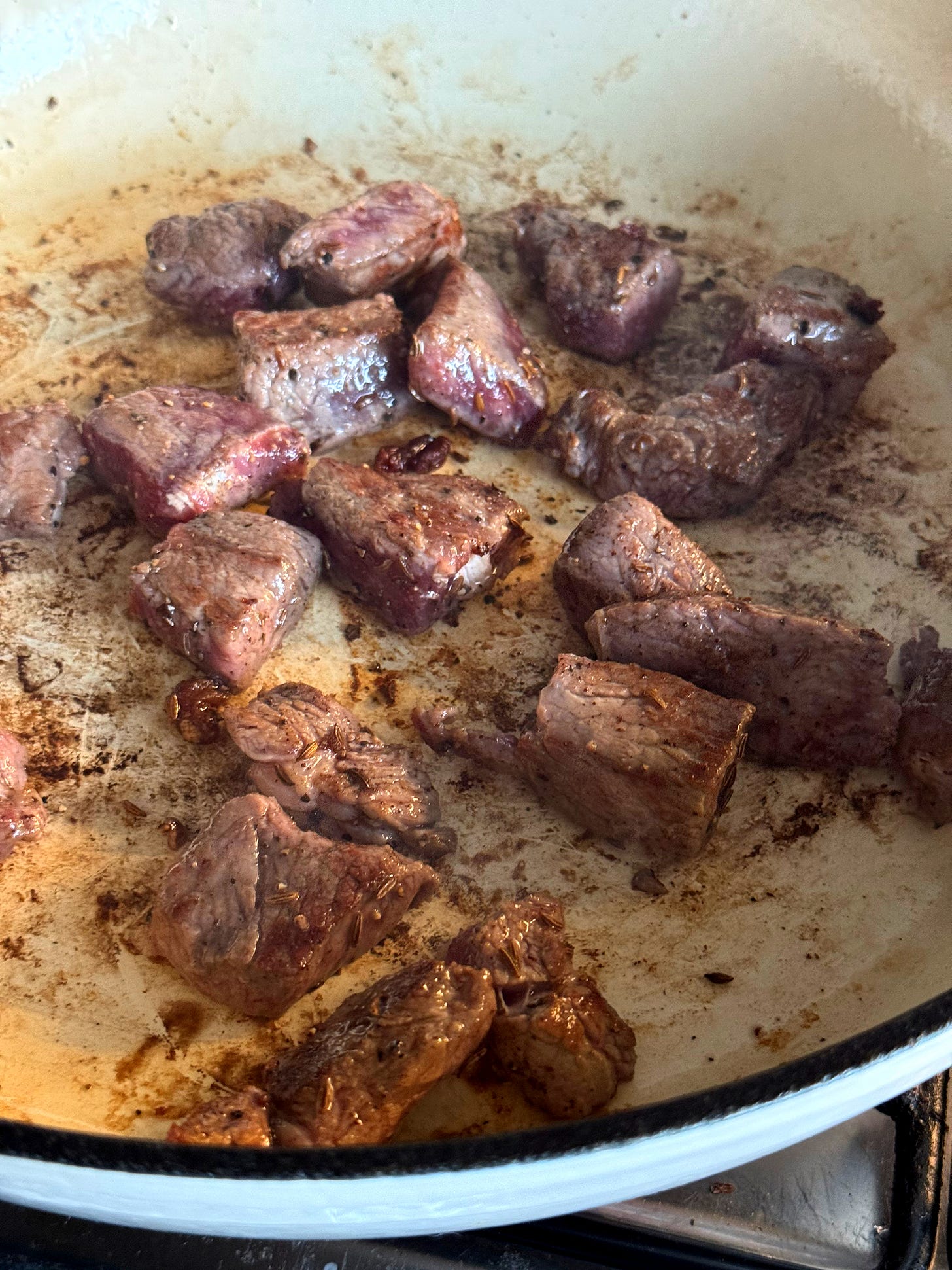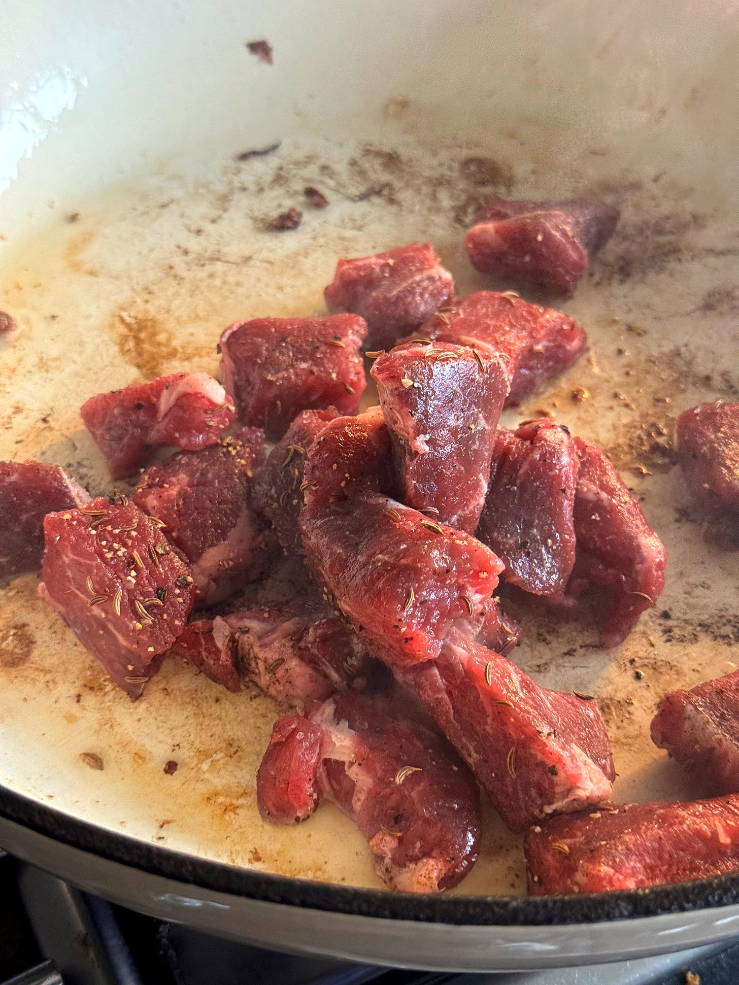 Now we’ll brown the beef. Place a frying pan or casserole onto a medium-high heat. Add any trimmed fat from the beef and fry it until it releases some liquid fat and adds some browning to the pan. Remove the solid fat and discard. Add the marinated beef and fry on medium-high heat until browned. Remove it from the pan and set it aside on a plate.