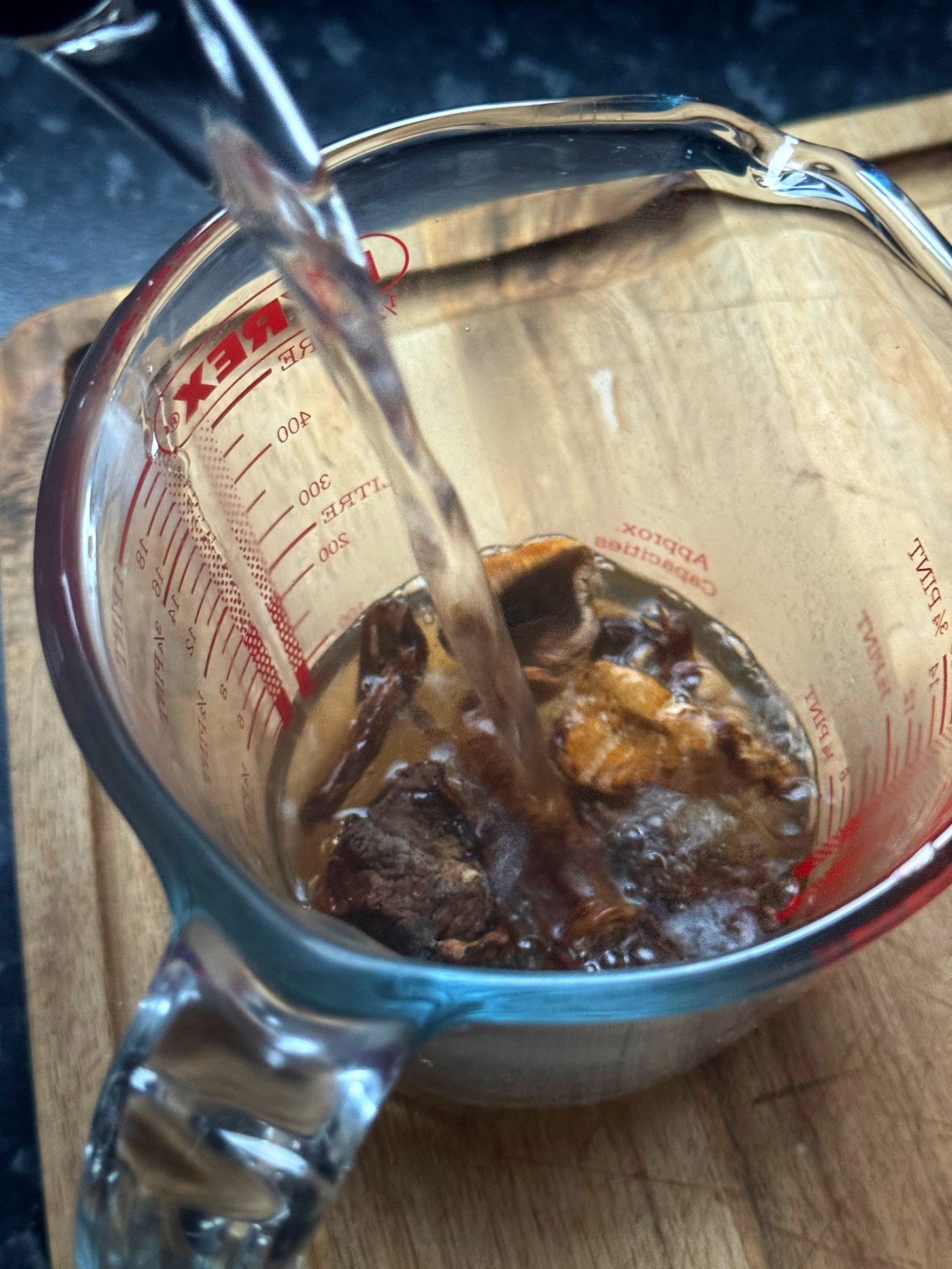 Now let’s soak the mushrooms. If using dried mushrooms, add the 10g dried mushrooms to a heatproof jug and cover with 100ml of boiling water. Allow the mushrooms to sit for 10 minutes to hydrate.