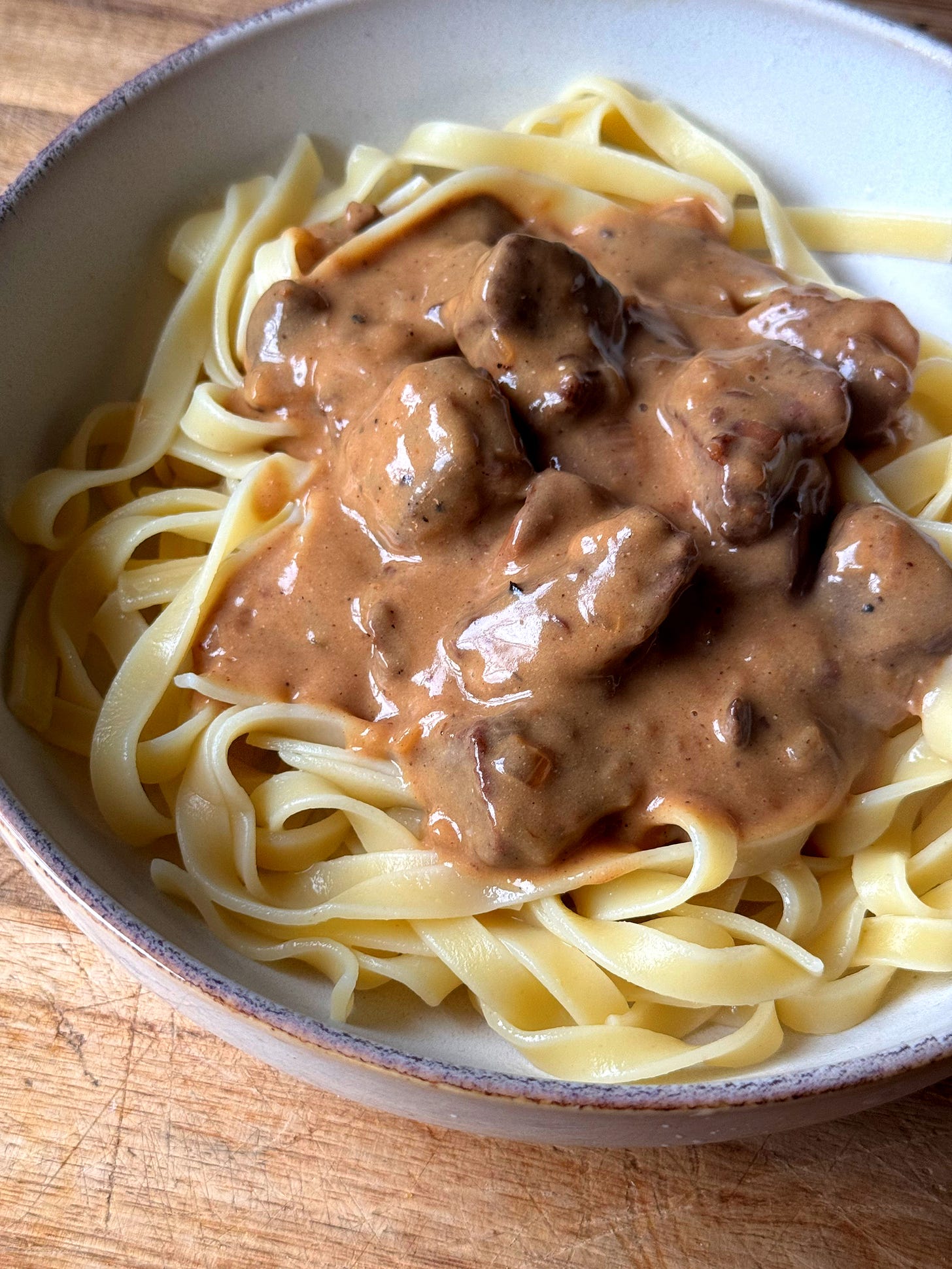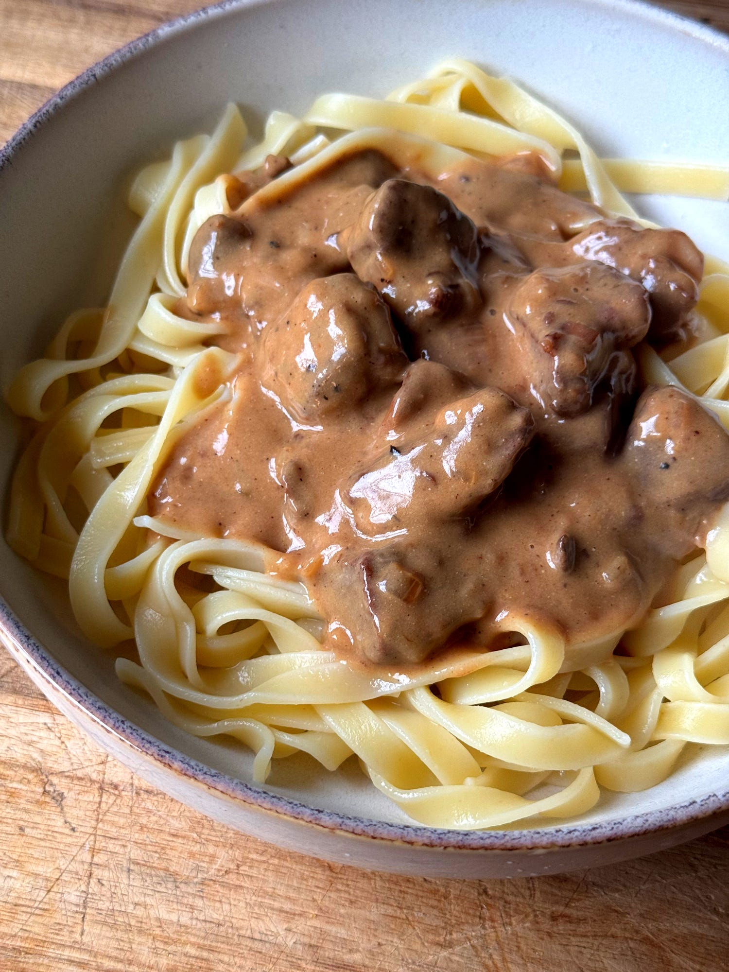 Serve the stroganoff with mashed potatoes, white rice or with boiled, rinsed pasta. Tagliatelle or short pasta shapes are great with this. Enjoy!