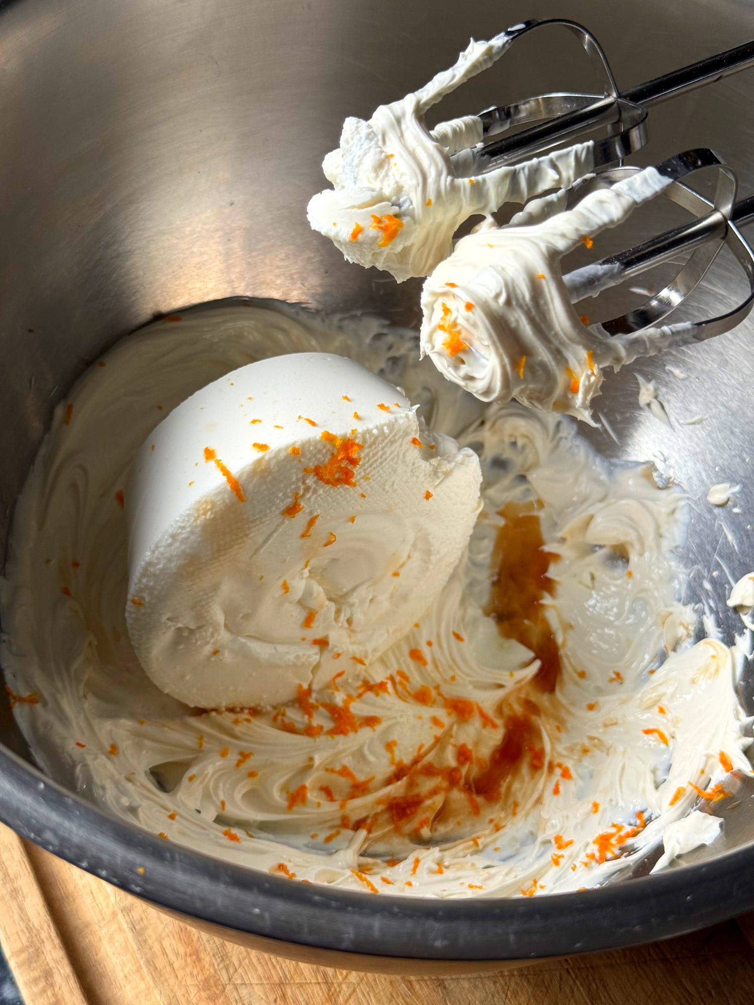 Add the drained ricotta cheese, 1 tsp vanilla extract, zest of 1/2 orange, 1 tsp lemon juice and 1/4 tsp salt and mix until well-combined.