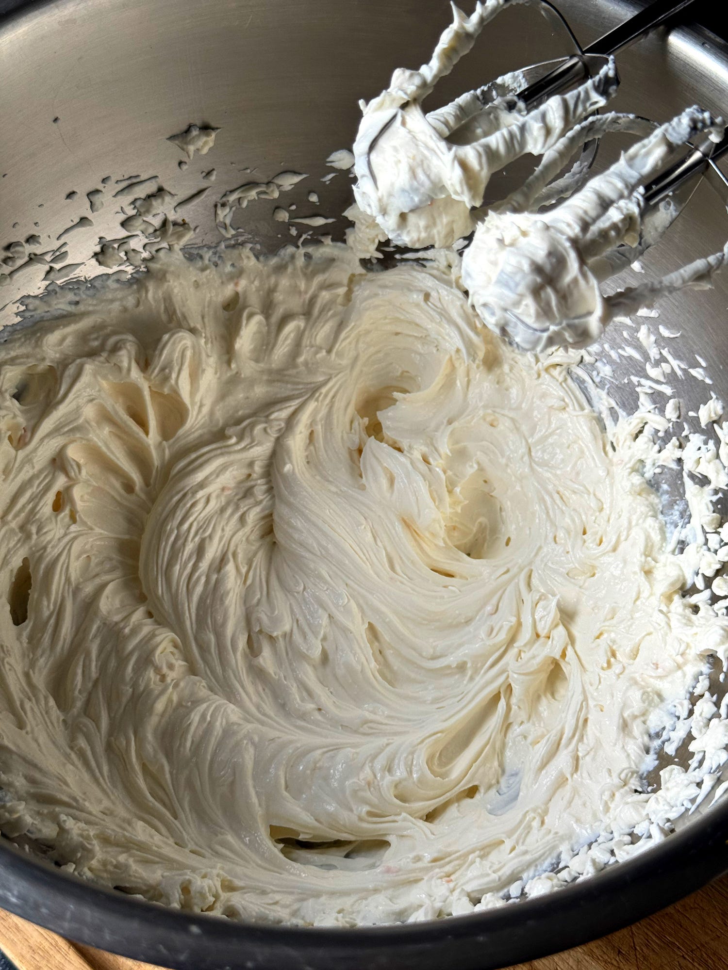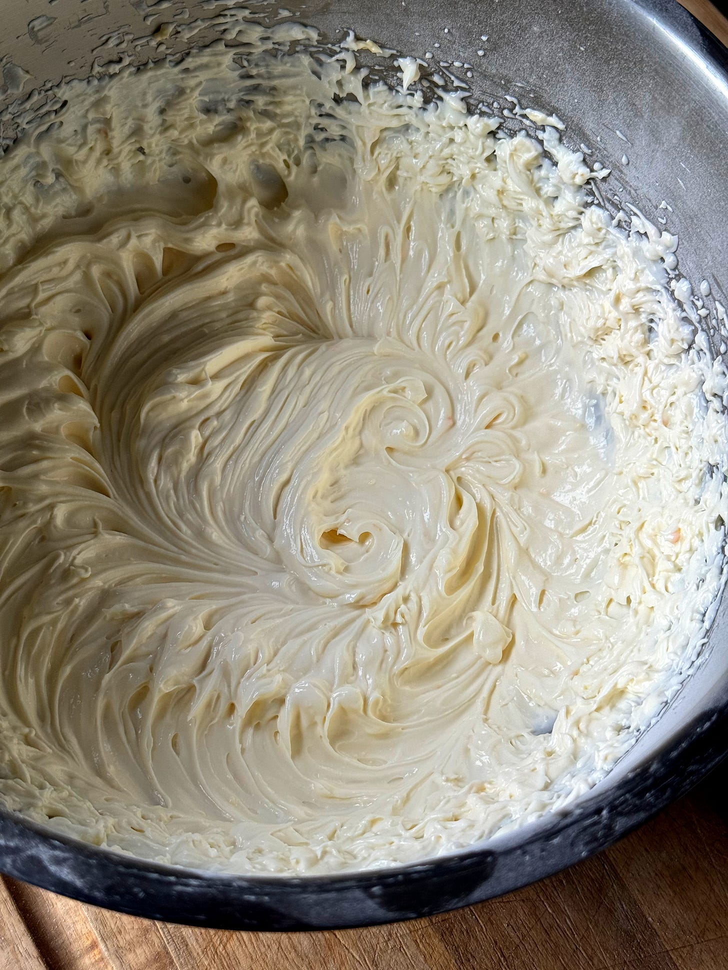 Now let’s make the ricotta-mascarpone icing. In a mixing bowl, beat the 250g mascarpone and 100g softened butter until smooth and creamy, about 1 minute.