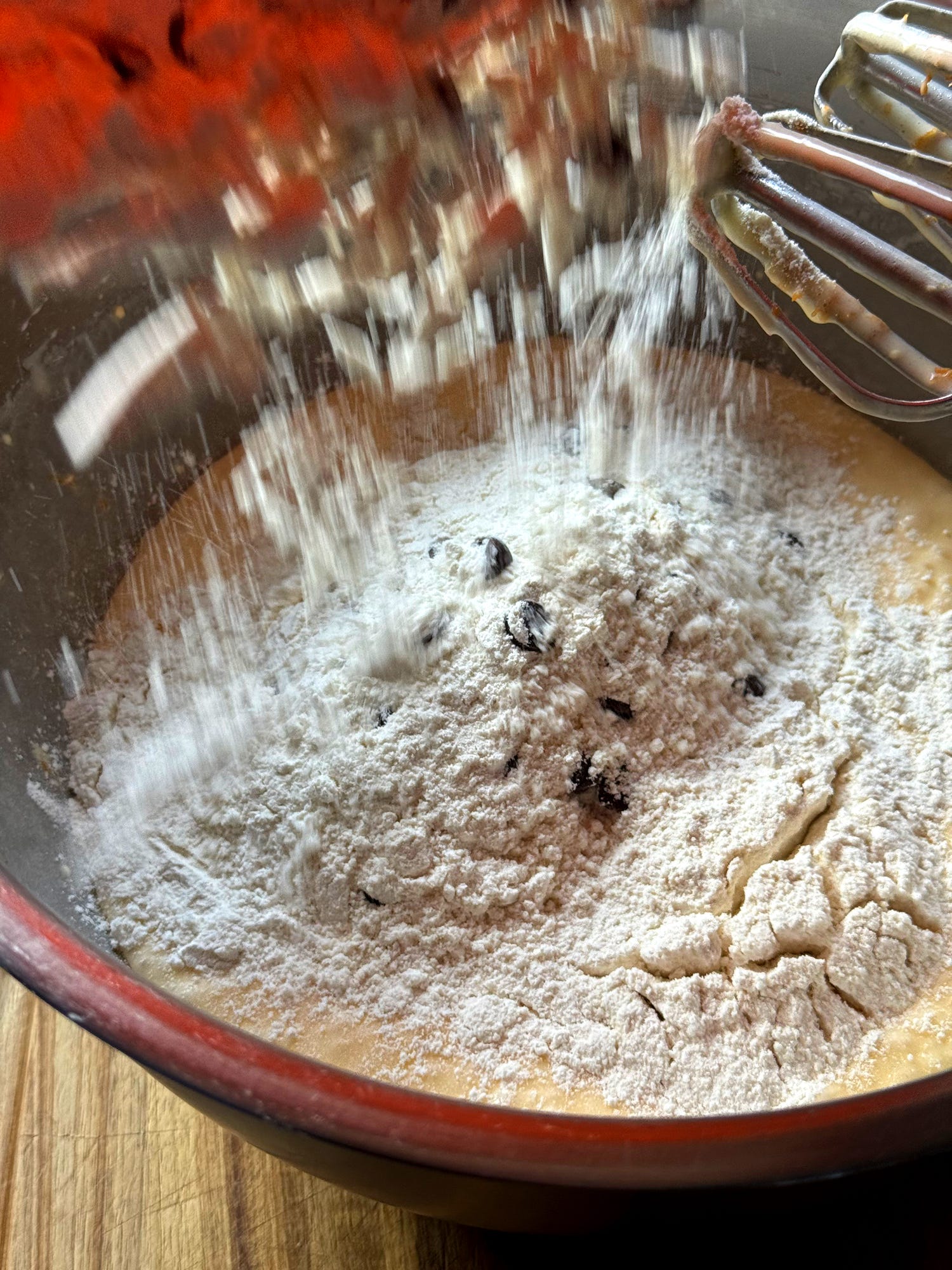 Combine the 320g plain flour, 2 tsps baking powder, 100g chocolate chips and 1/4 tsp salt. Add it into the wet batter and fold it in gently until combined.