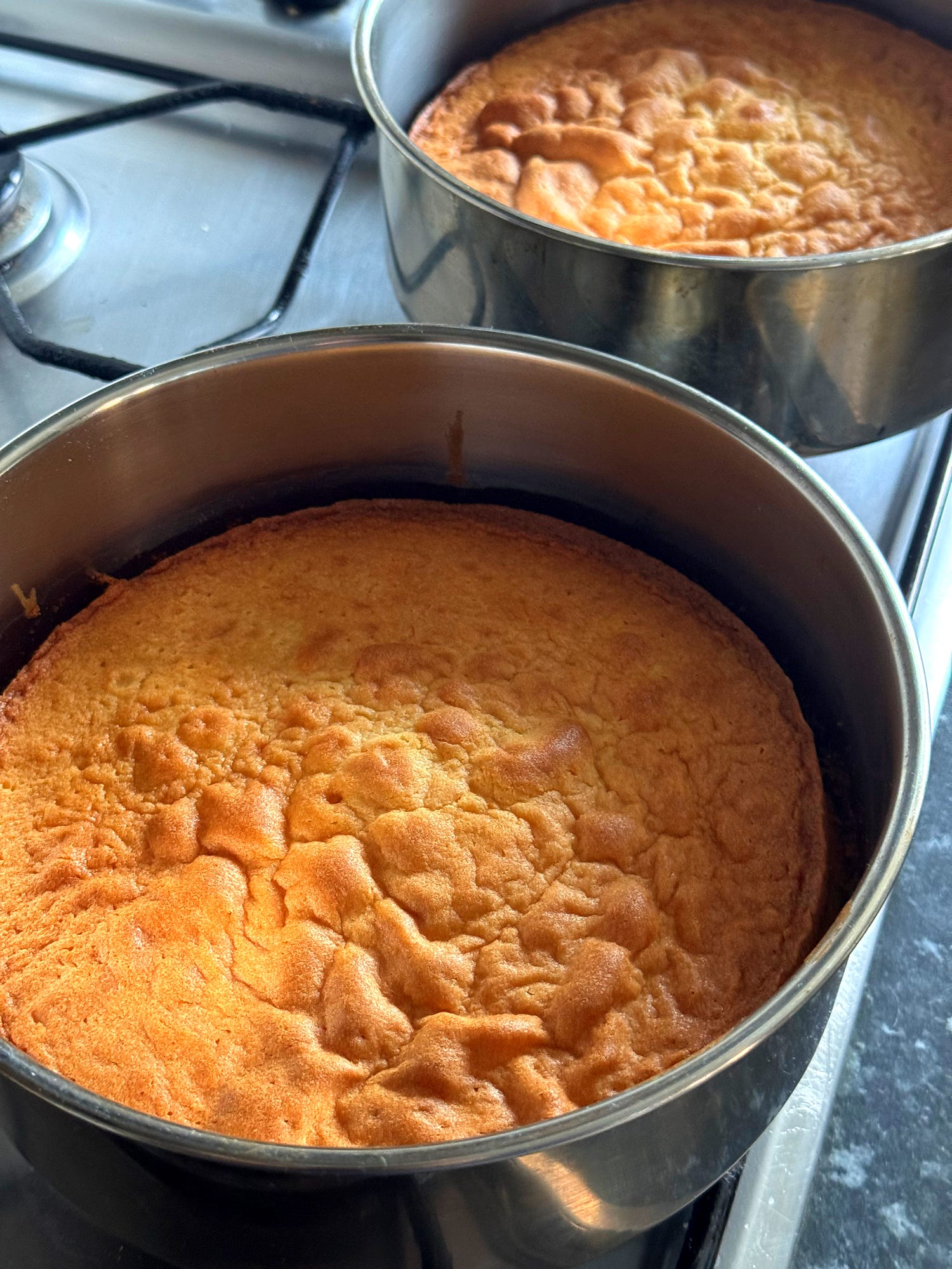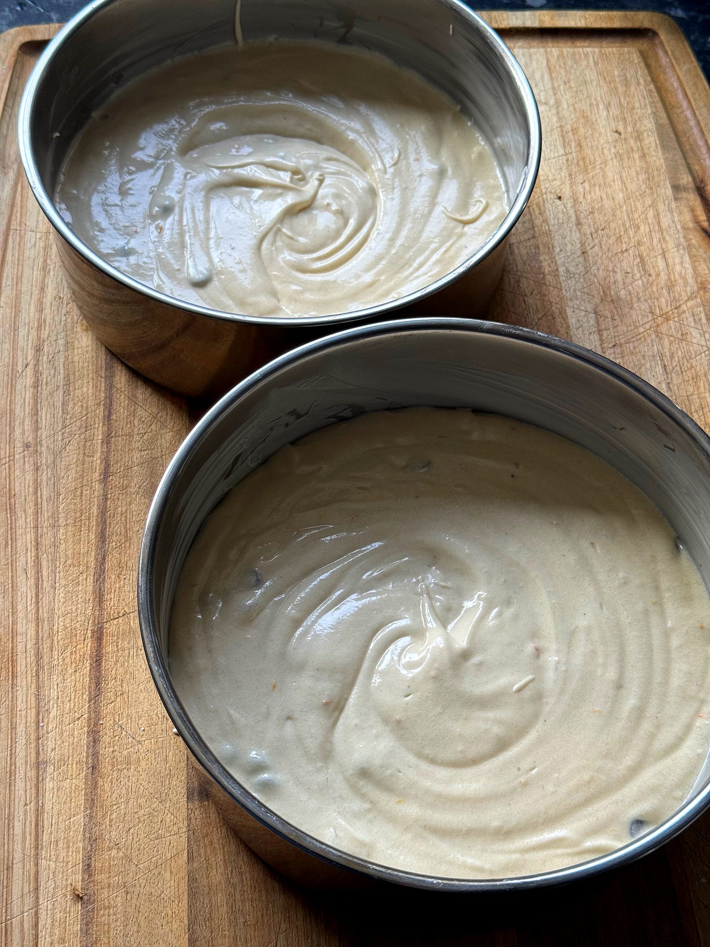 Divide the batter evenly between the 2 cake tins. Place the cake tins on the middle rack of the oven and bake for 35-40 minutes at 180C/350F, or until the cakes are well-risen and a toothpick inserted into the centre comes out clean. Let the cakes cool completely and shrink back.