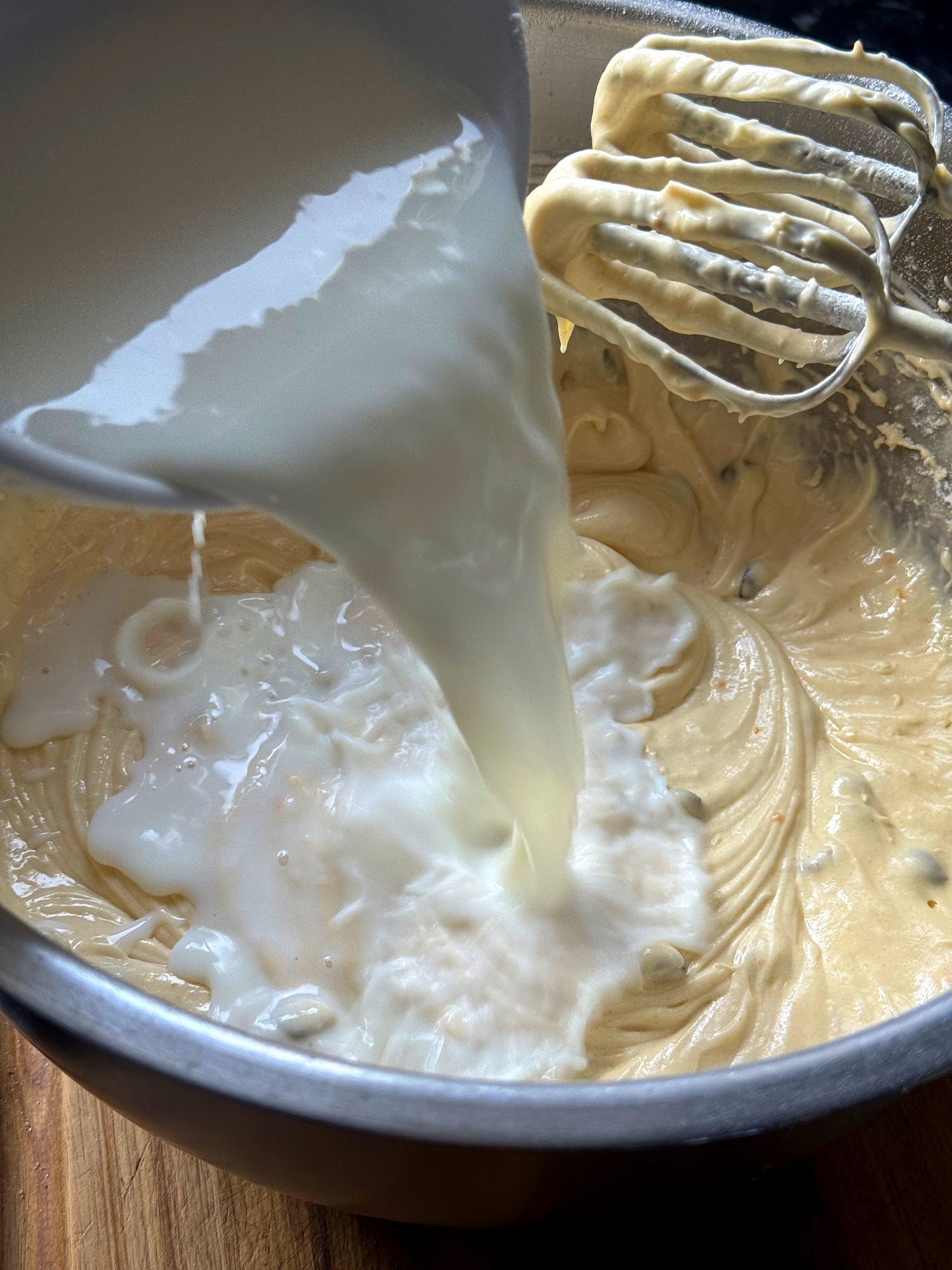 In a small bowl, combine the 200ml milk and 1 tablespoon lemon juice. Leave the mixture to sit for 1 minute to lightly curdle. Add this mixture to the batter and mix briefly to combine.