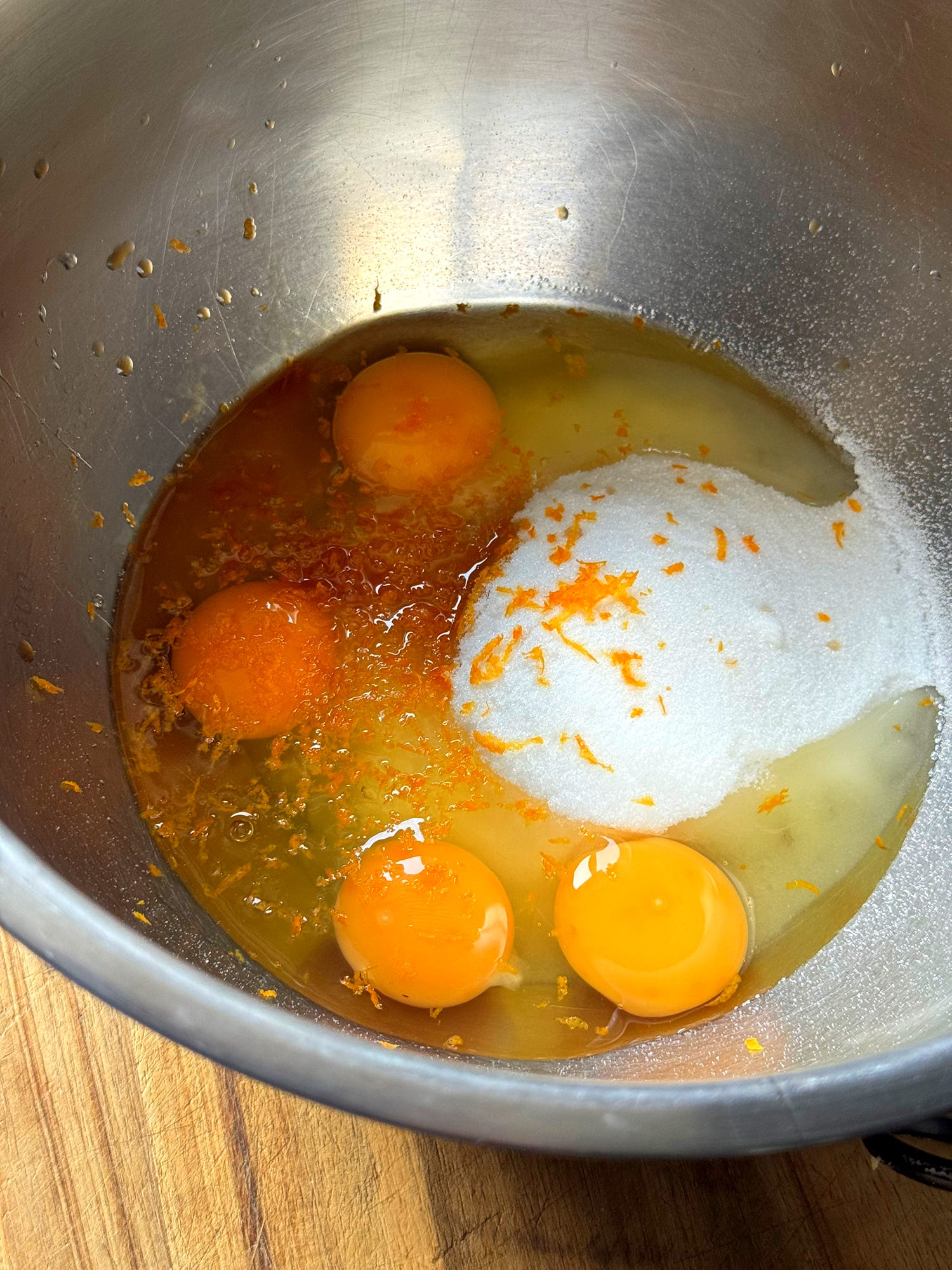 In a mixing bowl, add the 300g caster sugar, 4 eggs, zest of 1/2 orange and 2 tsps of vanilla extract and whisk on high speed until pale and mousse-like, about 3-4 minutes.