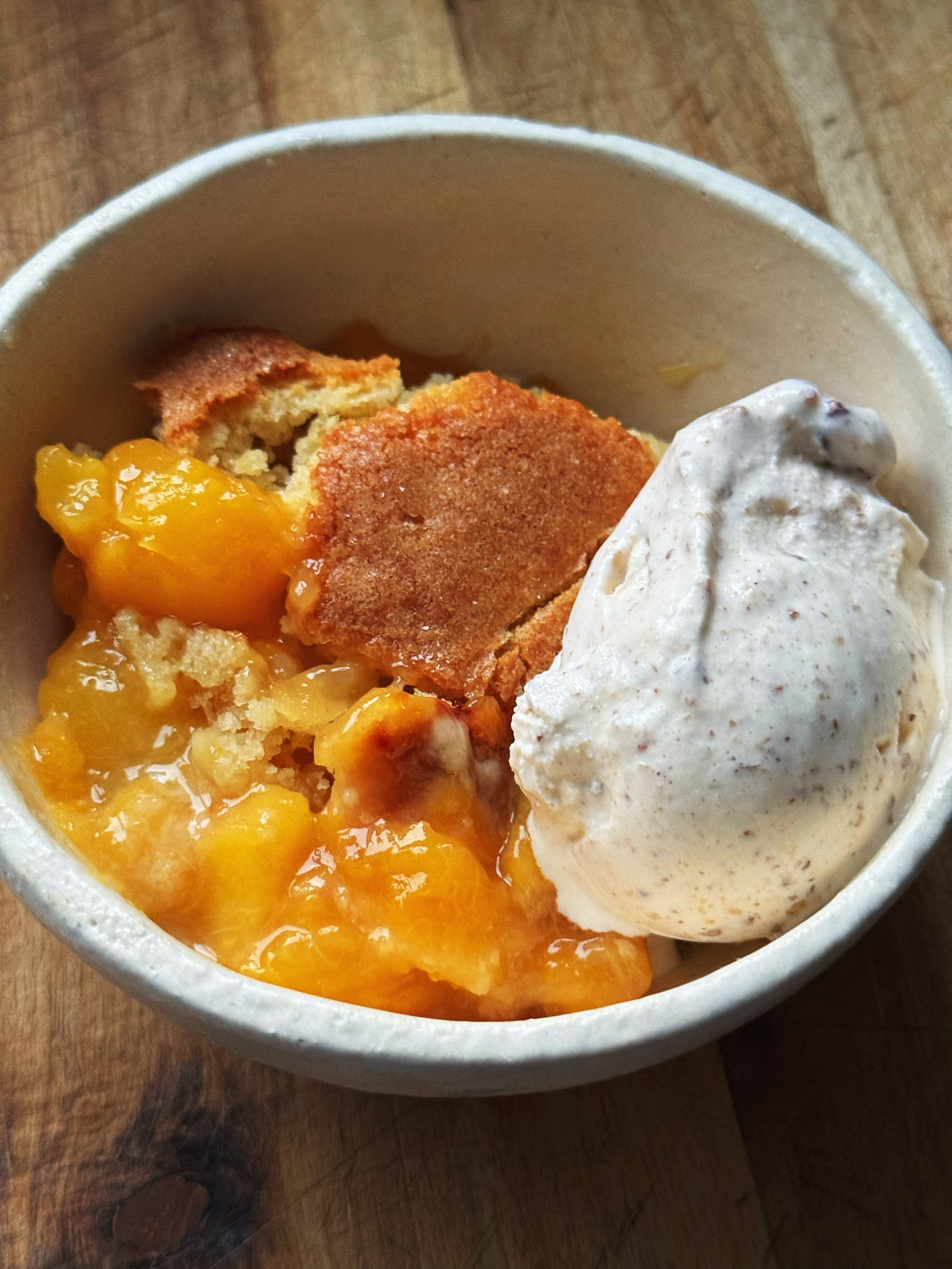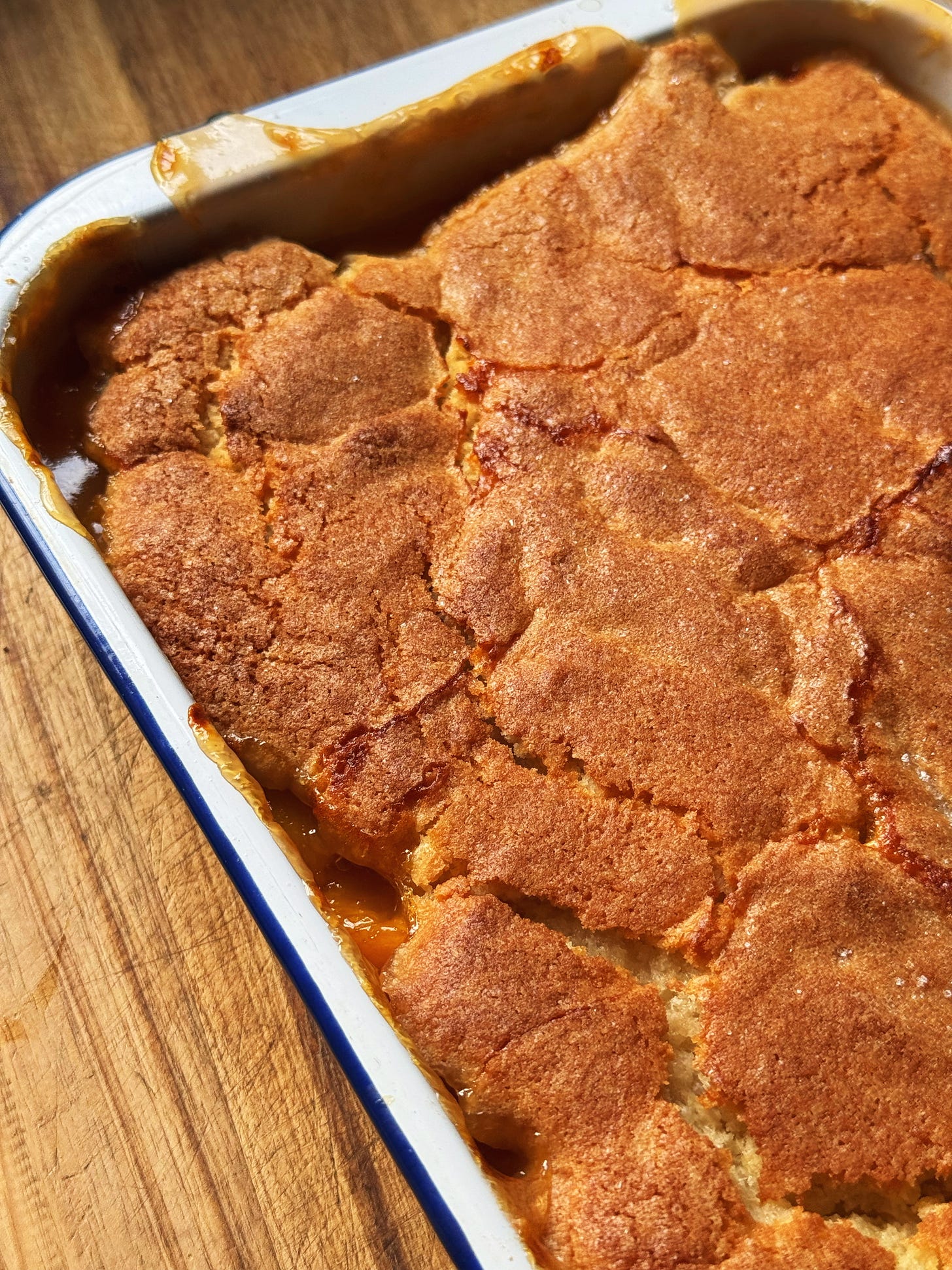 Peach cobbler is the queen of desserts in the American South, making use of quality Southern peaches which are in season from late summer and into autumn. Bright, jammy Georgia peaches, buttery scone dough and a skiff of cinnamon provide the perfect bridge between the seasons. There are many methods for making peach cobbler that vary widely by state and by town. Many Southerners have grown to love an extremely ‘juicy’ style of cobbler, where the cobbler dough retains a gooeyness from copious amounts of syrupy peaches. This recipe isn’t a mega juicy one like that, but instead keeps the integrity of soft, fluffy scone-like dumplings, with crisp, buttery edges like shortbread, and saucy peaches beneath it. It’s an entry-level placement in legendary Southern desserts, whether you make it with fresh peaches or canned ones. Let’s go!