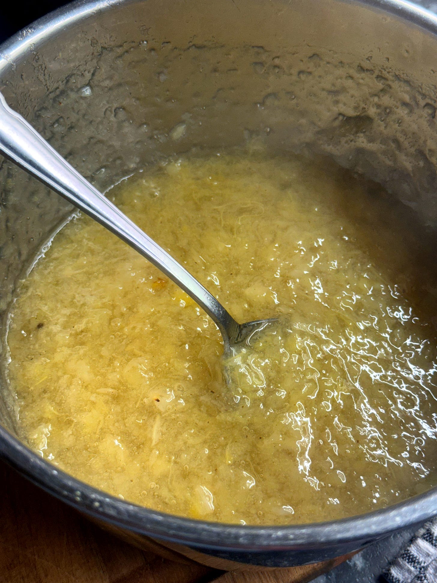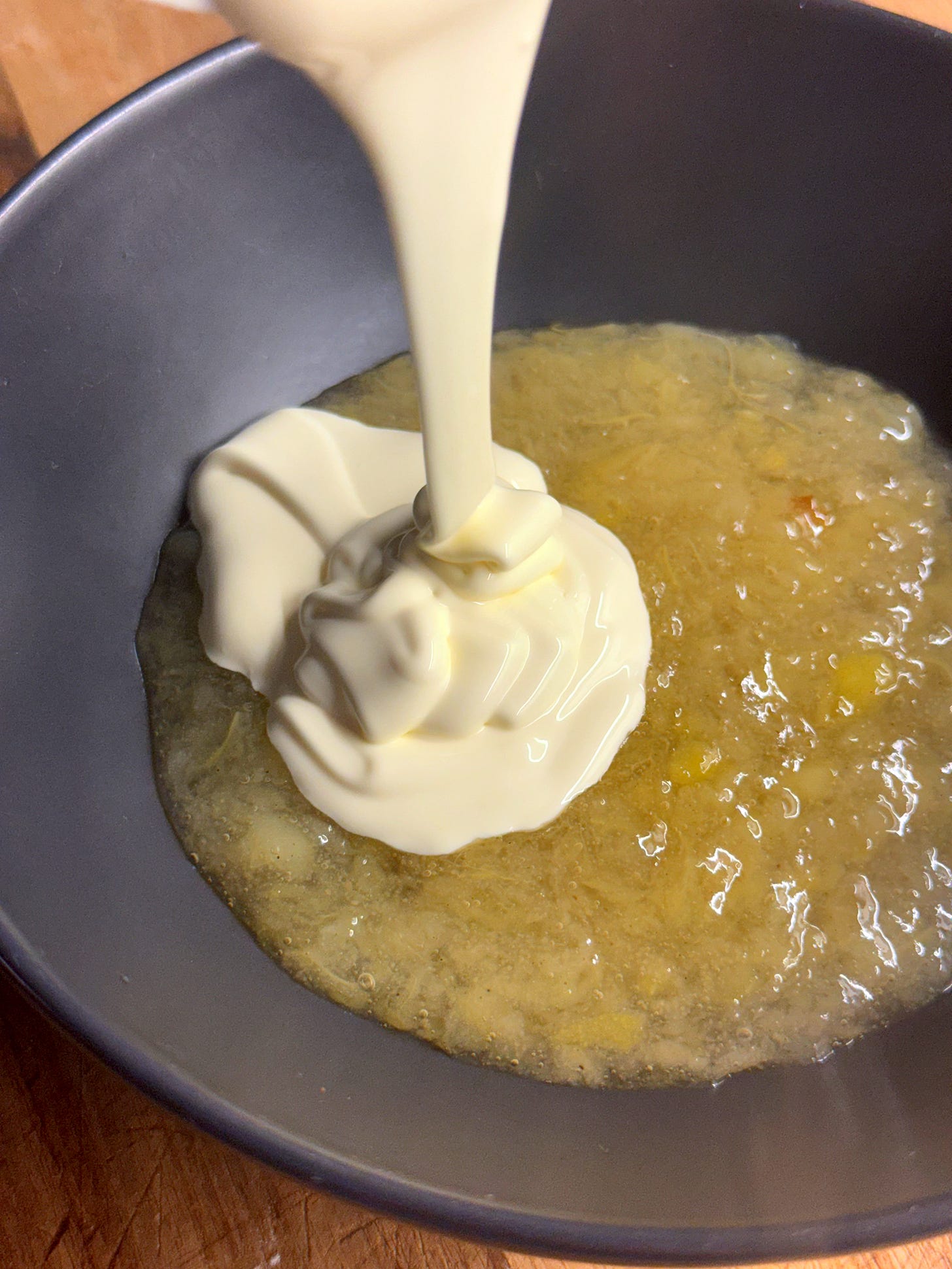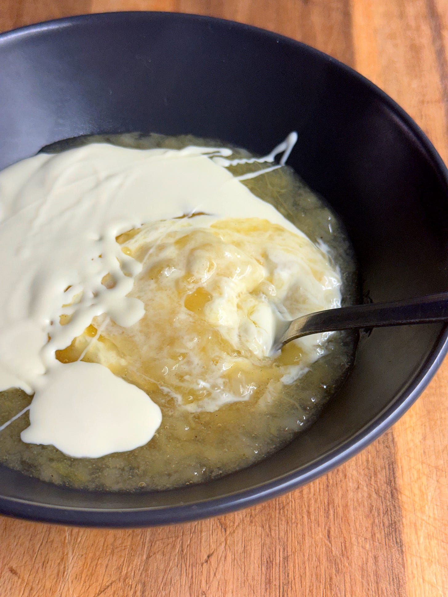 Once thickened, taste the pear pudding and adjust the seasoning. It should taste slightly incomplete - like it’s missing something. That missing piece will be accomplished by the cream later when served. Add more sugar or lemon juice if desired. It should have the consistency of yoghurt - use more potato starch to thicken it or loosen with water if needed.
