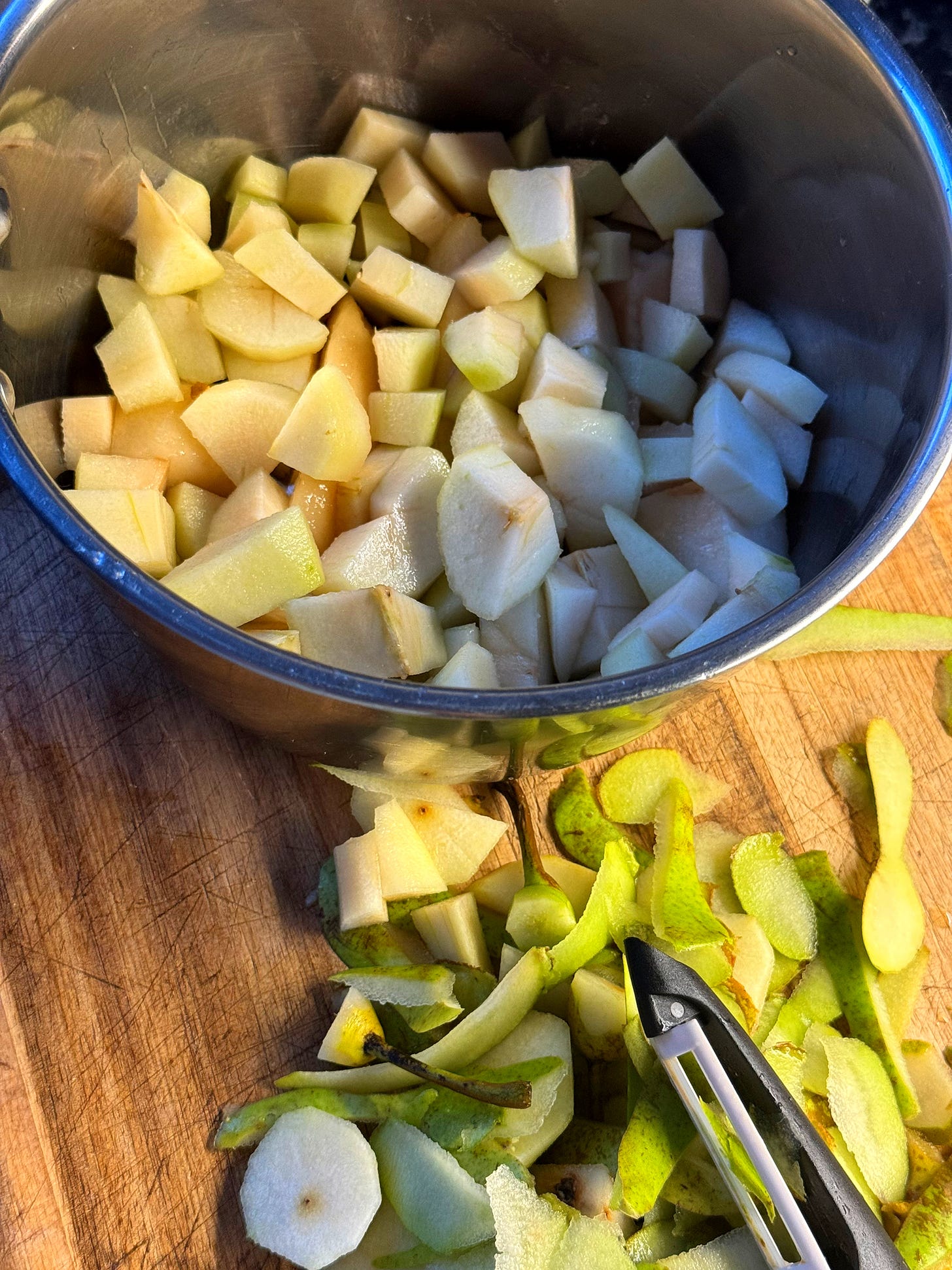 Peel the pears and cut away the stems and core. Dice the pears into roughly 1/2-inch sized dice. You will need around 400g of diced pears.