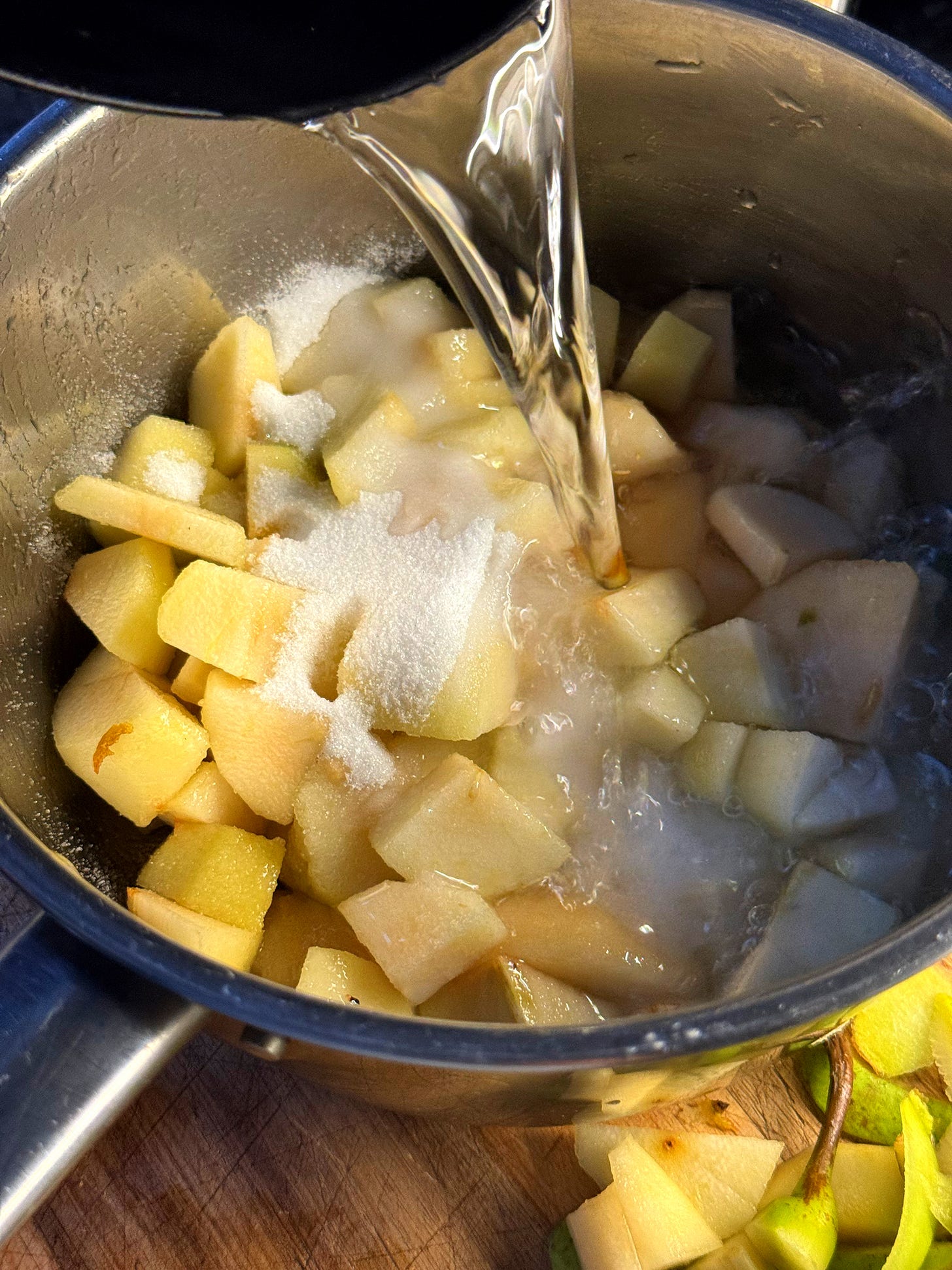 Place the 400g diced pears into a saucepan along with 3 tablespoons of sugar, 1 tsp lemon juice and 250ml of water. Place the pan onto medium-high heat and bring to a boil.