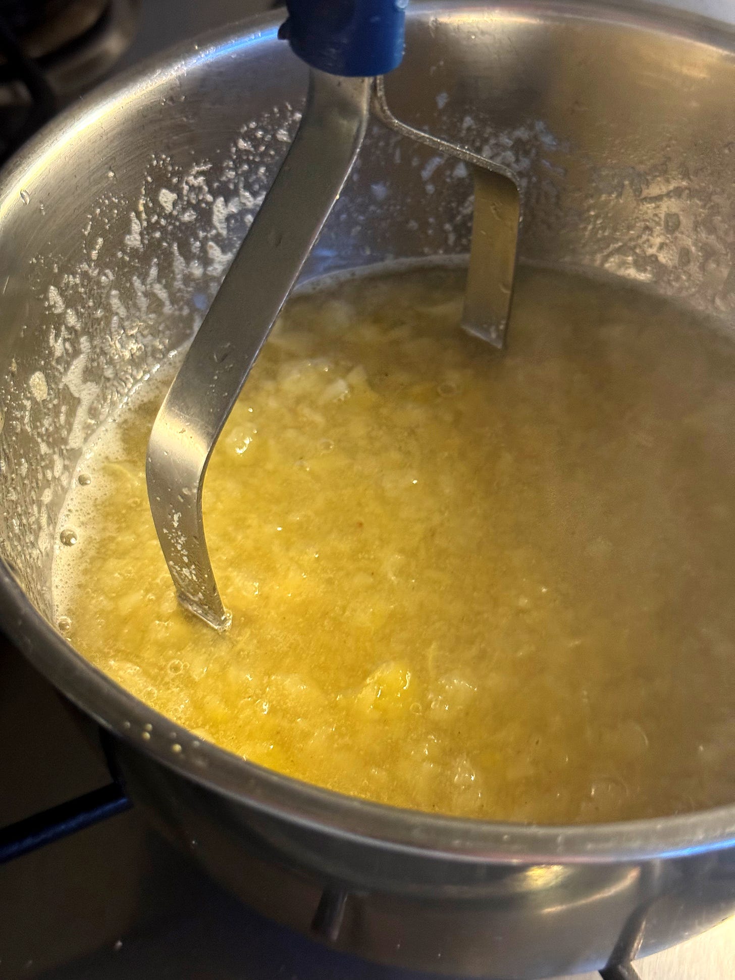 Once boiling, reduce the heat to a simmer. Simmer the pears for 10-20 minutes until they begin to soften and break down. The exact time will depend on the ripeness and type of pears used. Once soft, reduce the heat to low and mash the pears with a potato masher until smooth. You may use a stick blender for extra smooth results if desired - some Swedes do like this a little chunky.