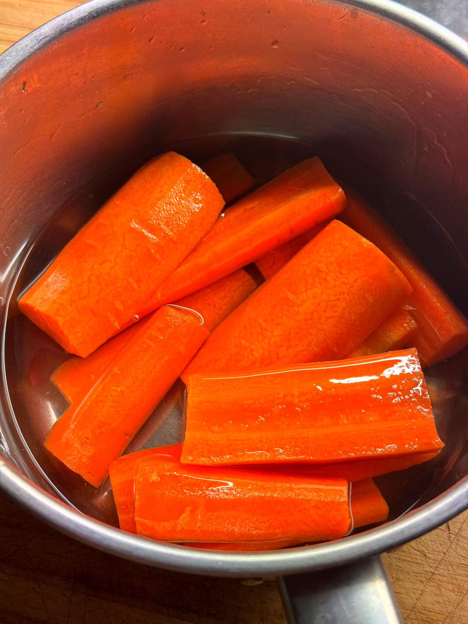 Place the 400g peeled, halved carrots into a saucepan with 1 tsp salt and cover with water. Place the pan onto medium heat and bring to a boil. Once boiling, cover and simmer for 10-15 minutes, until the carrots are almost knife tender. Drain and set aside.