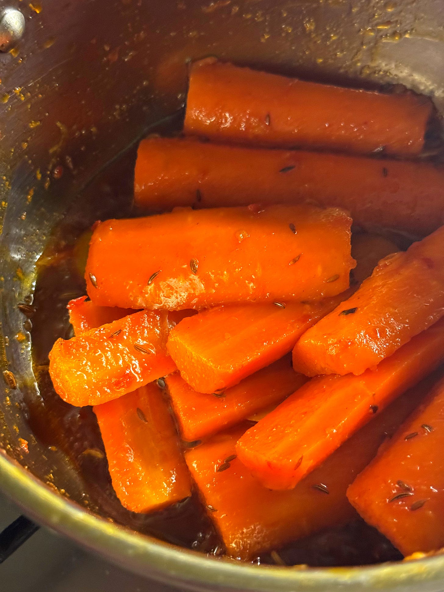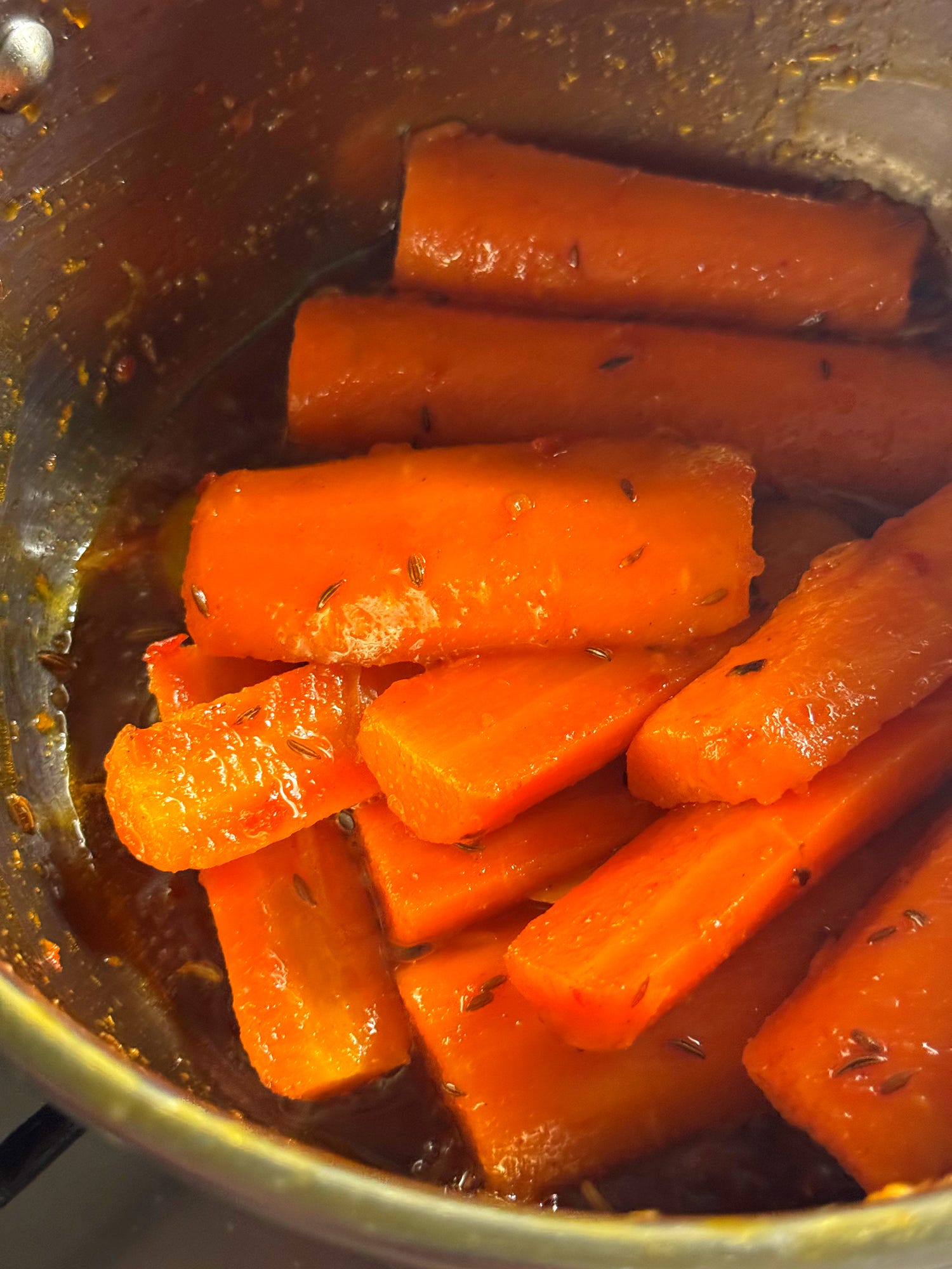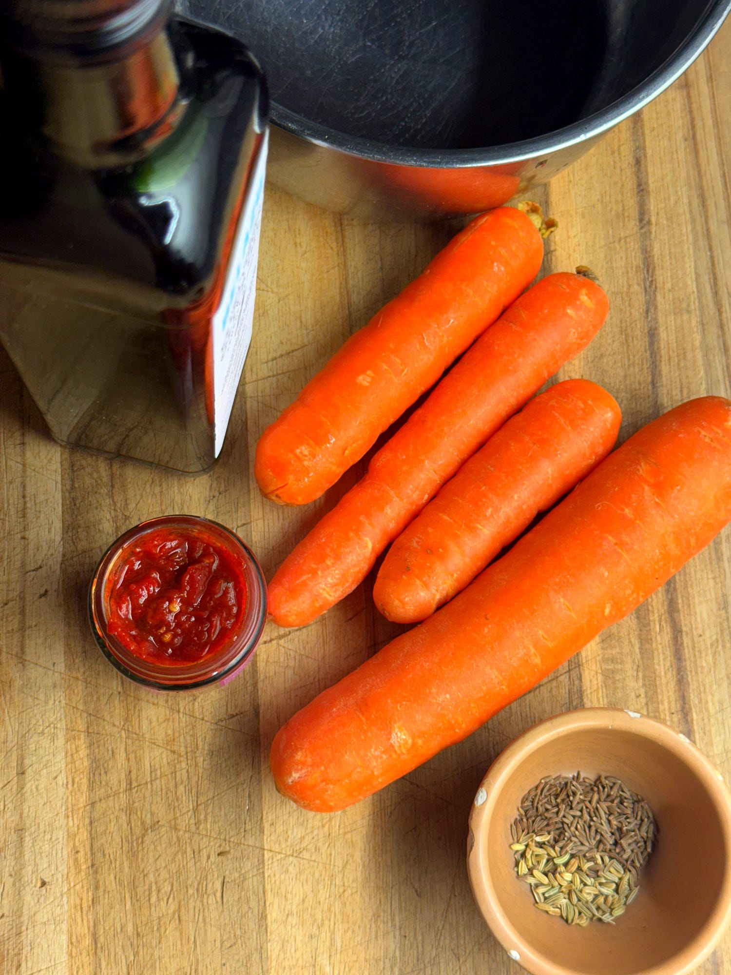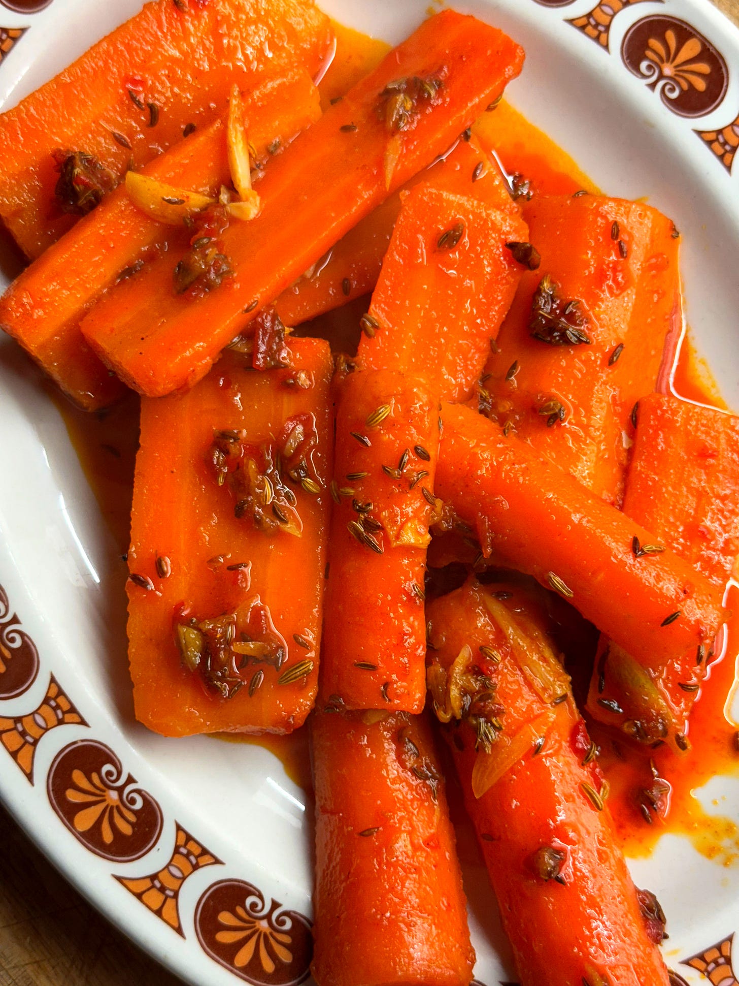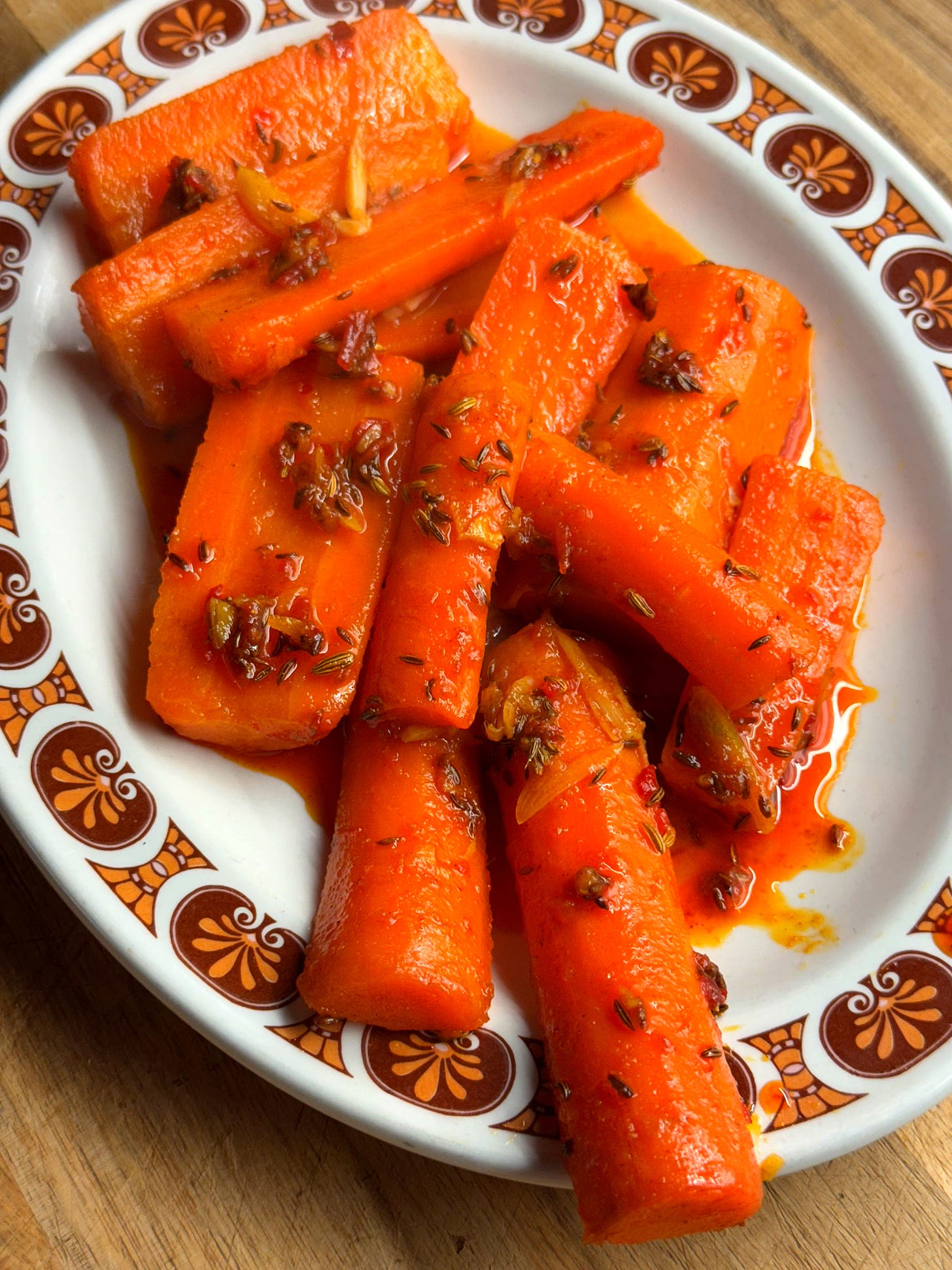 This dish is usually eaten as a small side dish (known as a ‘slata’ in Tunisia) or as a gleaming crown atop a heap of cous cous to share. The preparation is very simple and just uses one pan; there’s no roasting involved either. The carrots are simmered until tender then combined with a spicy balm of harissa pasta and earthy spices. Enjoy it as part of a broader assortment of ‘slatas’ or mezze, or as a jewel in the crown. It’s particularly good served alongside black olives and oil-packed tuna. It’s a nice change of scenery for carrots - known as ‘zroudi’ in Tunisia - and gives them a bit of primetime spotlight for once. Let’s go!