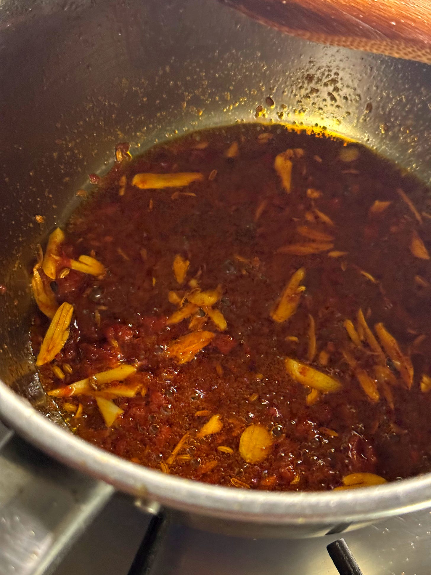 Add the 2x cloves sliced garlic, 1-2 tsps harissa paste and 1/2 tsp ground coriander. Stir until the hot oil until the oil is stained red.