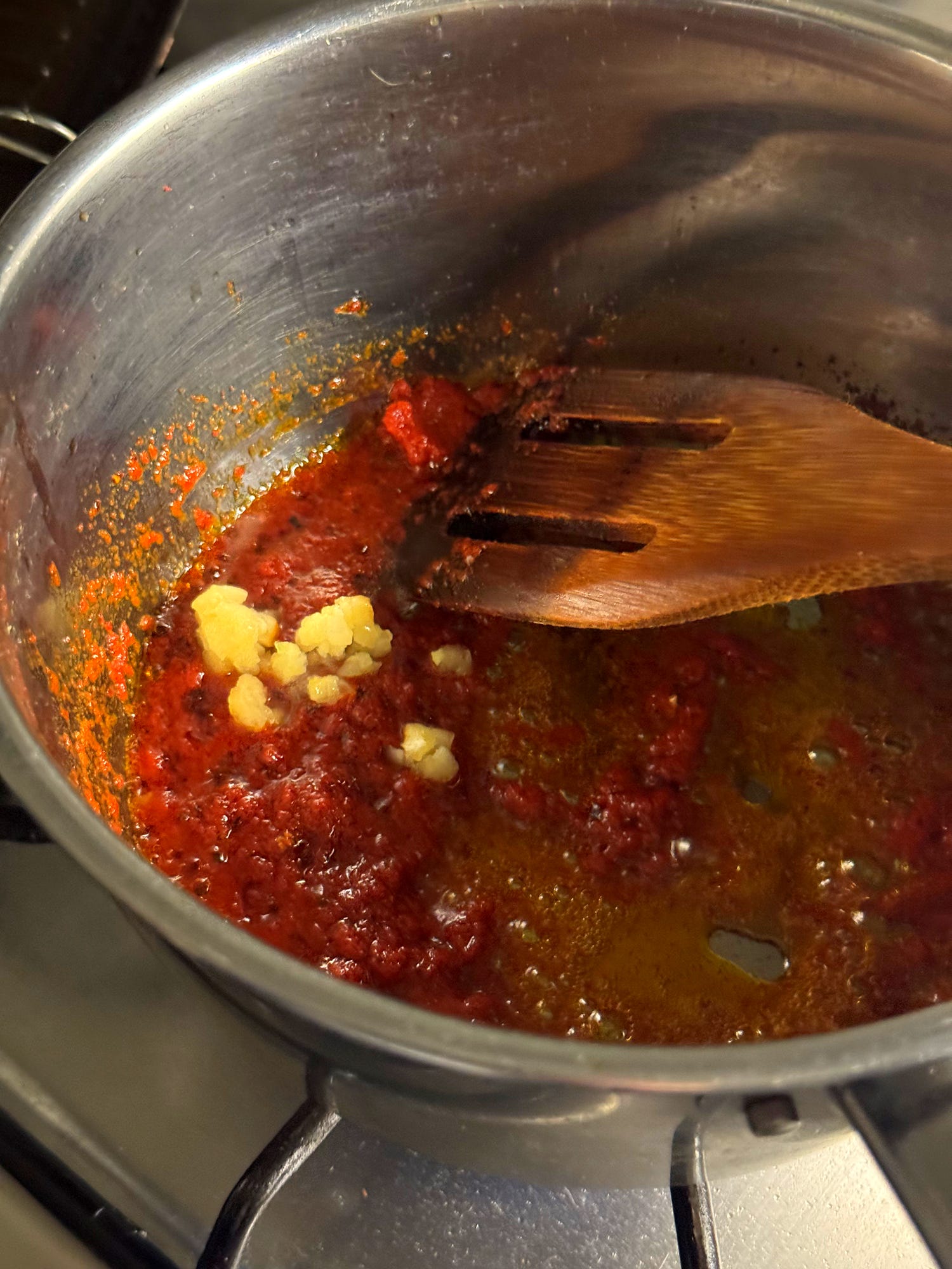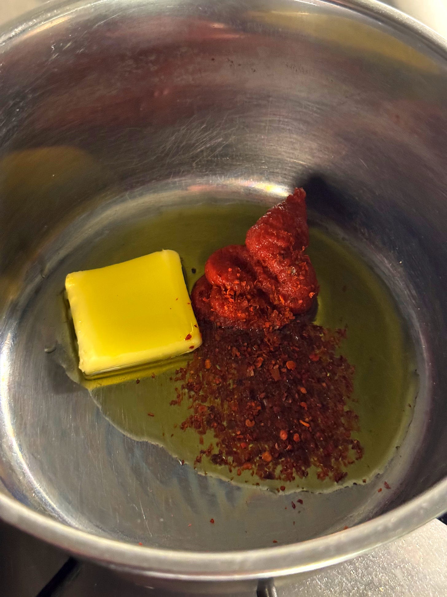 First, let’s make the tomato sauce. Place a saucepan onto medium heat and add the 1 tablespoon of olive oil and a 25g piece of butter. Once shimmering hot, add the 2 tablespoons of tomato paste, 1 tsp paprika and 1/2 tsp Aleppo pepper (or 1/2 tsp chilli flakes). Fry the paste until it is deepened in colour and rich, about 1 minute.