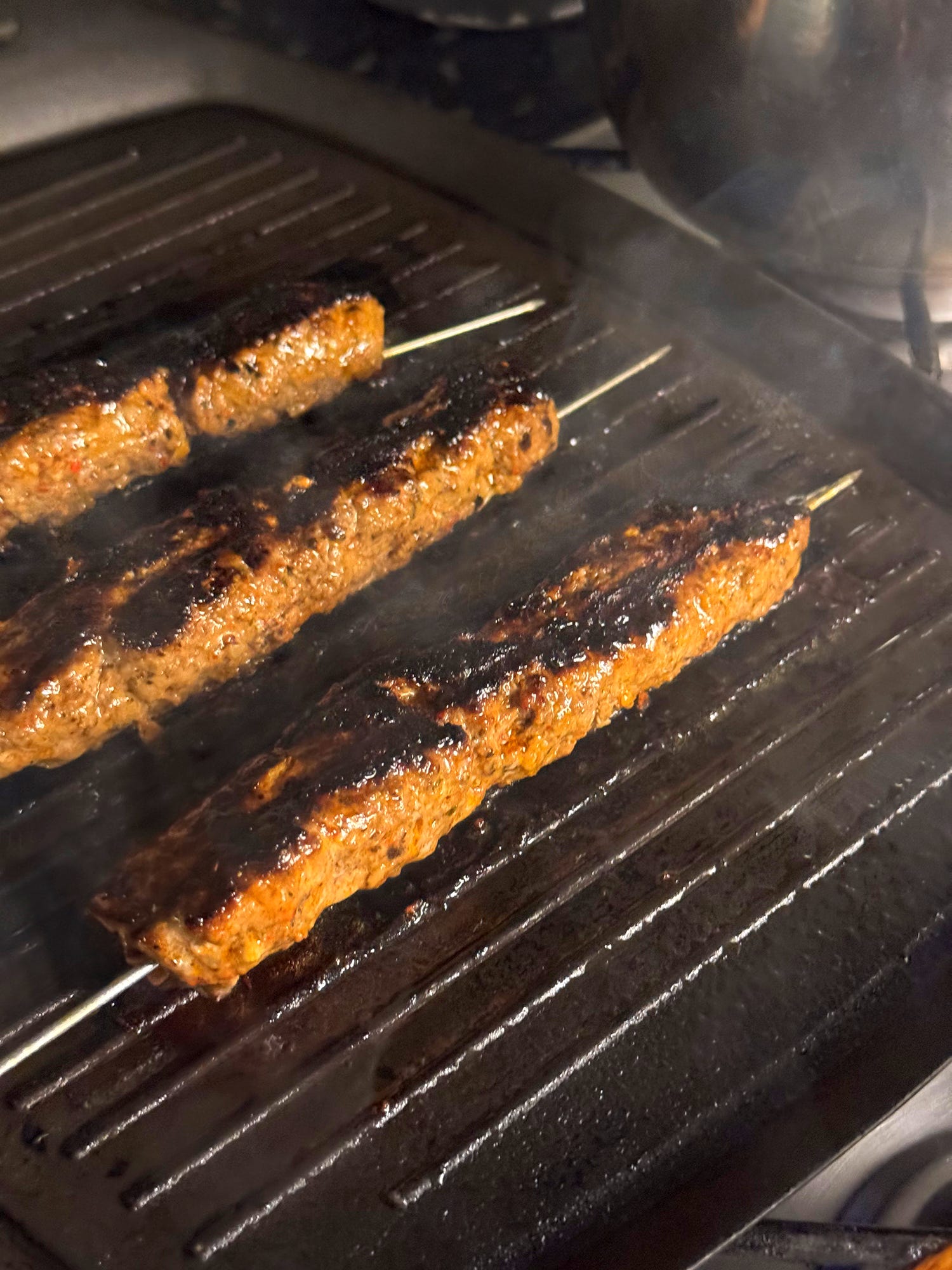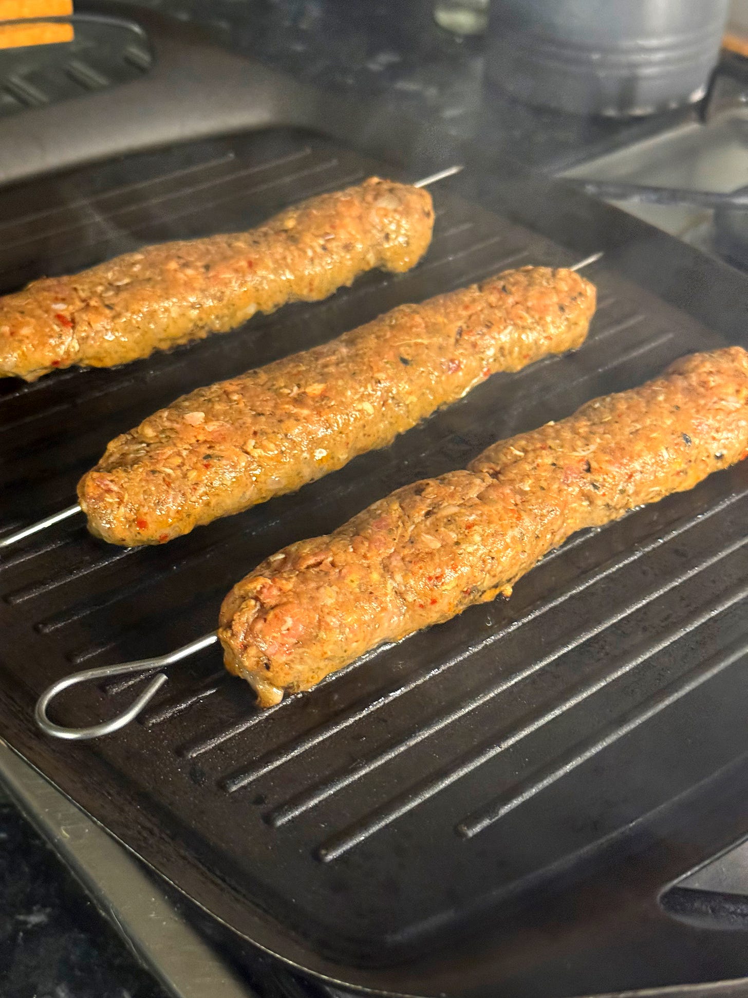 Now let’s grill the kebabs. If using a frying pan or griddle, preheat it for 5-8 minutes to ensure even heating. If using a grill or broiler, set a wire rack over a baking tray and preheat a grill to high. Alternatively, you can also cook these over a charcoal barbecue. Cook the kebabs, turning them once, for 2-3 minutes per side until charred in places. They should start releasing their fat towards the end of cooking. Once cooked, allow them to rest for 2 minutes.