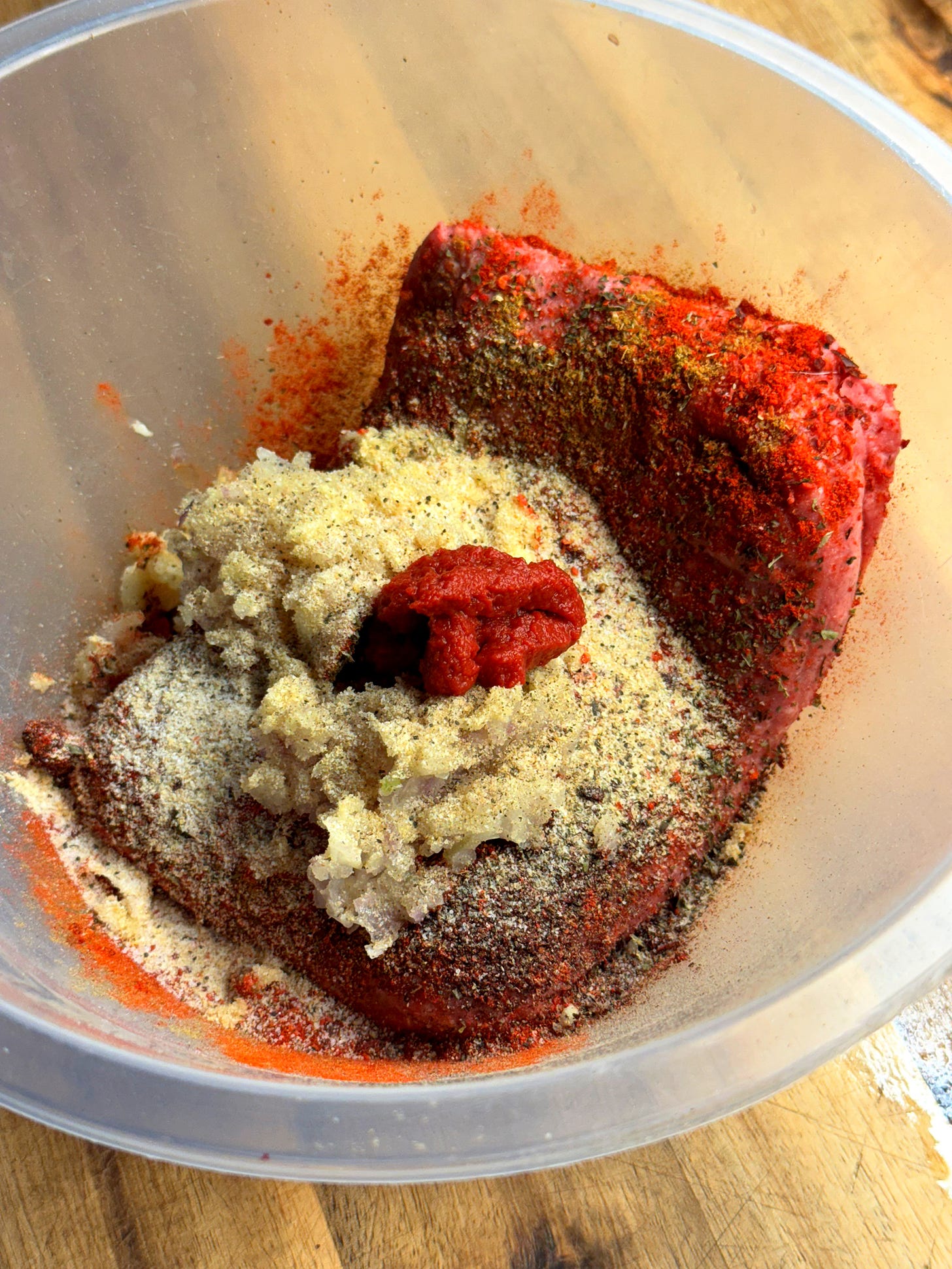 Now let’s make the meat kebab mixture. In a mixing bowl, combine the 500g minced lamb, 1.5 tsps salt, 1/2 tsp black pepper, 2x cloves of grated garlic, grated shallot, 2 tsps tomato paste, 1 tsp cumin, 1 tsp paprika, 1 tsp Aleppo pepper (or 1/2 tsp chilli flakes) and 1 tsp dried mint. Mix well with your hands until the mixture is well-combined.
