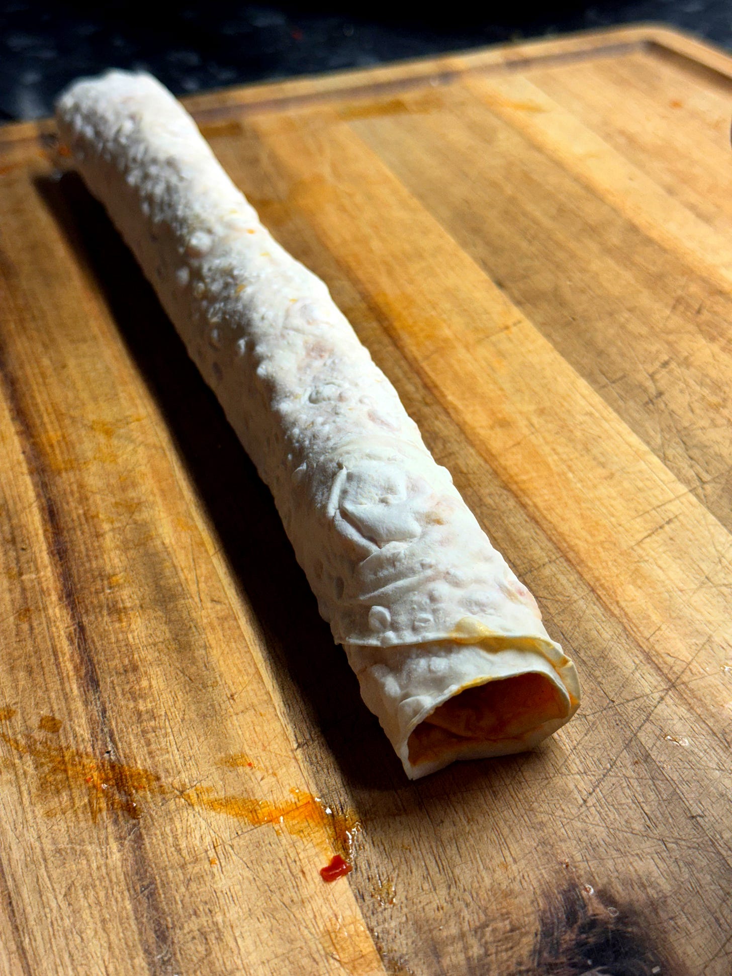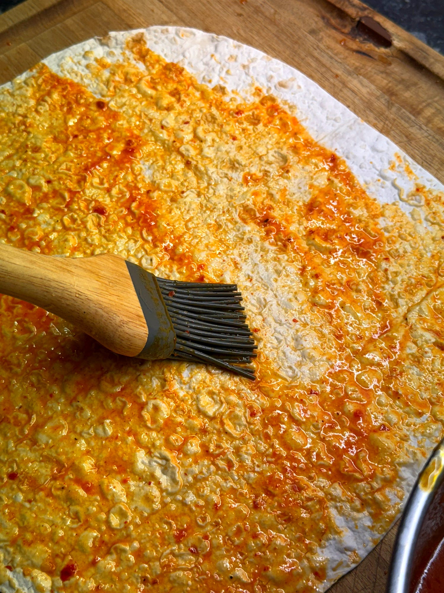 While the kebabs rest, let’s prepare the bread wrapping. Place a piece of lavash bread or a flour tortilla onto a chopping board. Brush the bread with the tomato sauce until dampened. Place 1-2 of the kebabs onto the bottom length of the bread and roll it up completely.