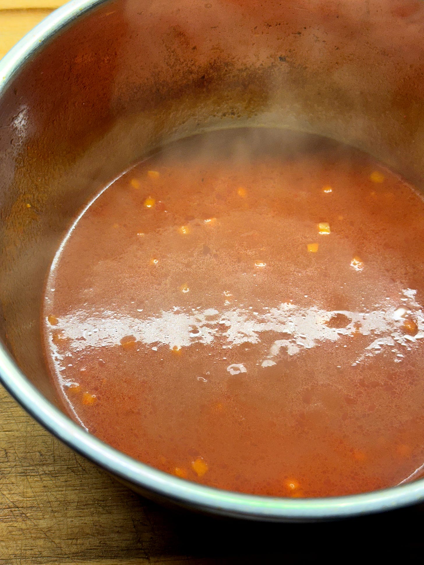 Once boiling, add the 1/2 tsp salt, 1/4 tsp pepper and a pinch of sugar. Reduce the heat to a low and simmer the sauce until rich and deepened in colour, about 5-10 minutes.