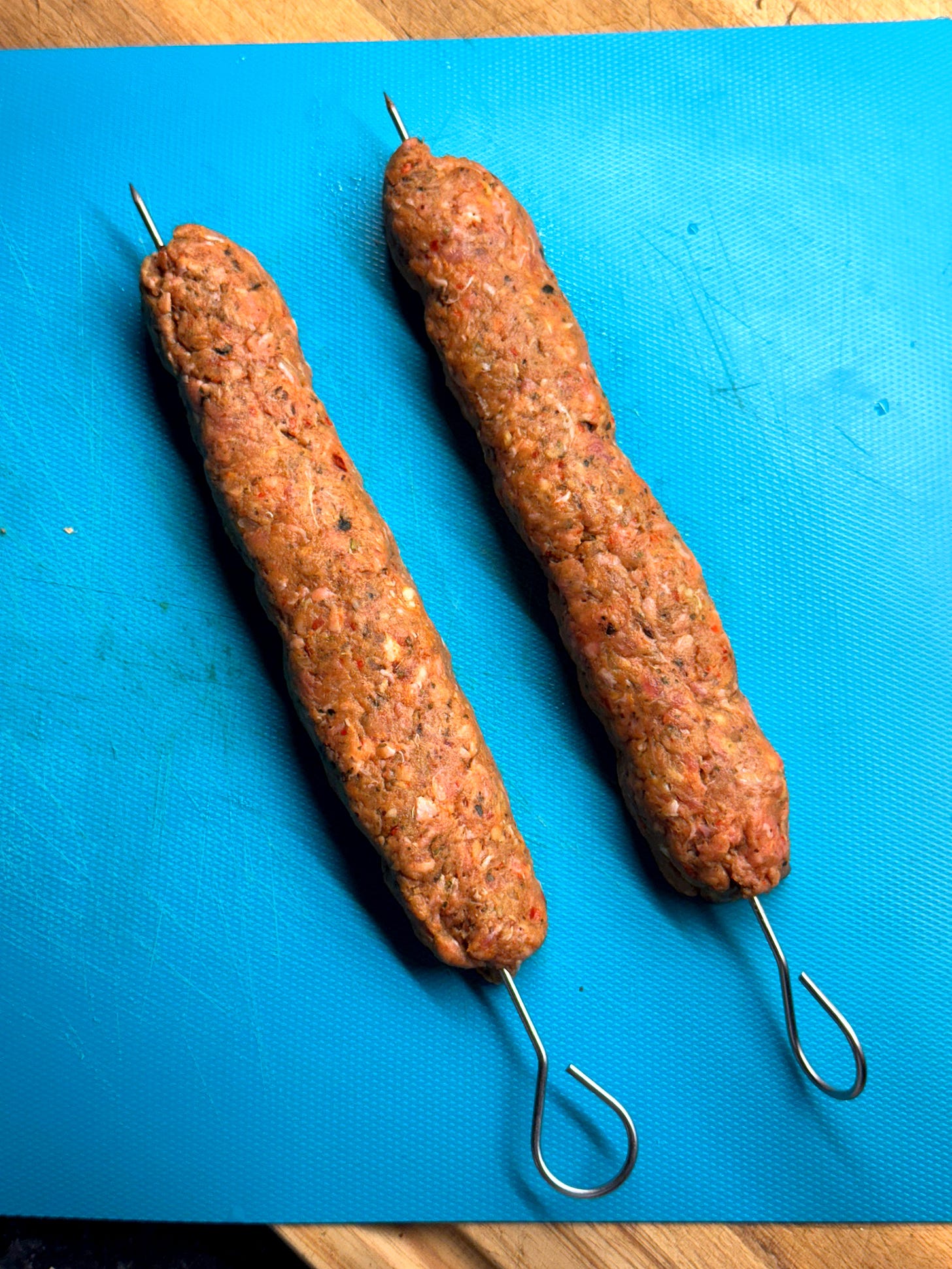 Now let’s shape the kebabs. Take a handful of the mixture and press it onto a skewer, using your palm and middle finger to shimmy the meat along the skewer. Leave a gap at the end of the skewer and near the handle for ease of turning. You can also use a flat surface to help even out the shape of the kebabs.