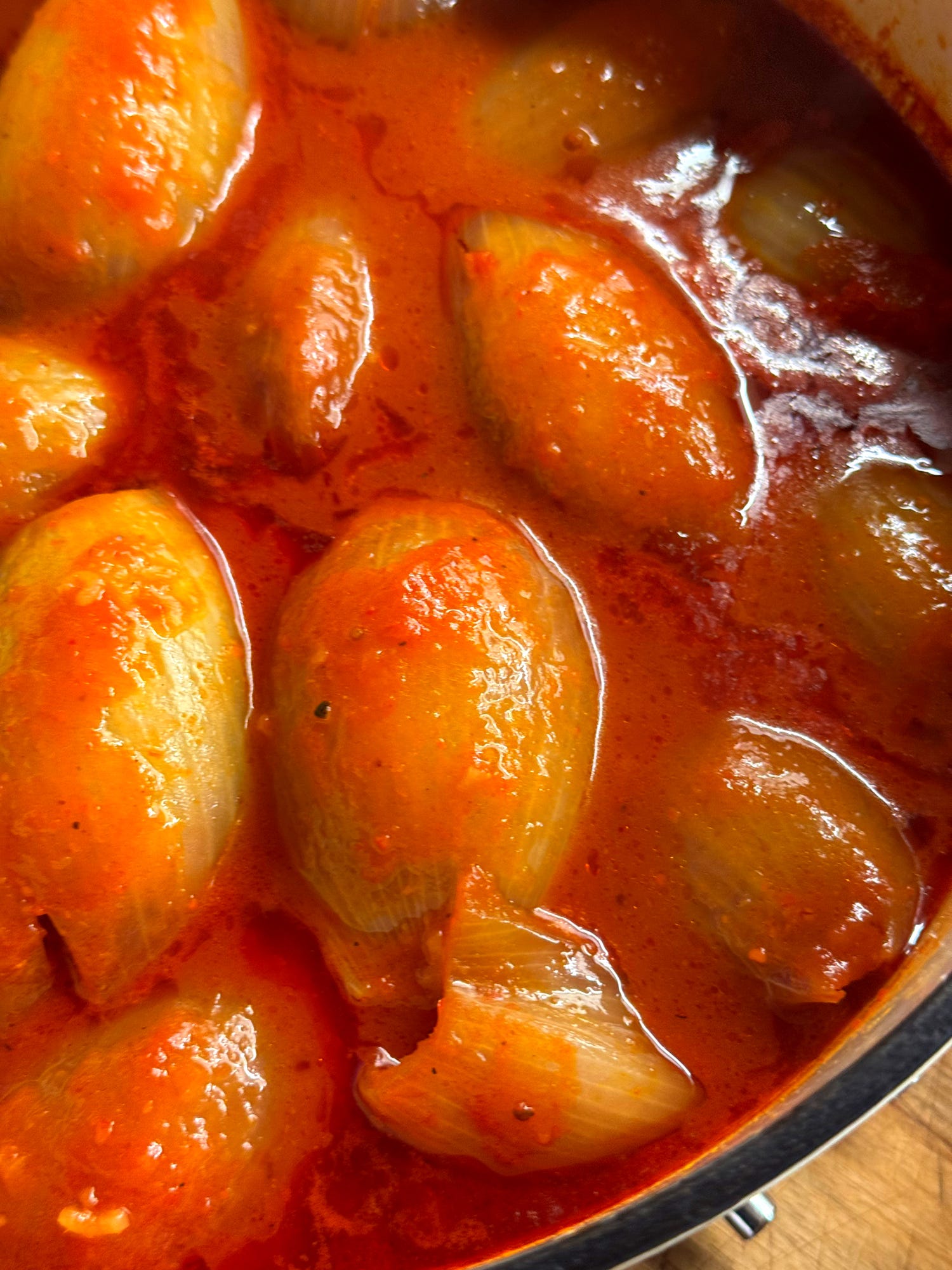 The idea of stuffing vegetables with meat and rice was very fashionable to the Ottomans, and as a result you will find some version of this dish eaten in many former Ottoman countries, and even a bit beyond. ‘Dolma’ involves stuffing the season’s vegetables and cooking them in a sauce. In this case, we are using onions. Large onions require a short boil to render them tender, making layers upon layers of edible wrapping paper for a juicy dolma mixture. This mixture uses a combination of beef/lamb and rice, with a slight sweetness from the addition of currants. Once wrapped, the onions are cooked in a rich tomato sauce until tender. Depending on the freshness of your onions, they’re ready to eat in under an hour. Let’s go!