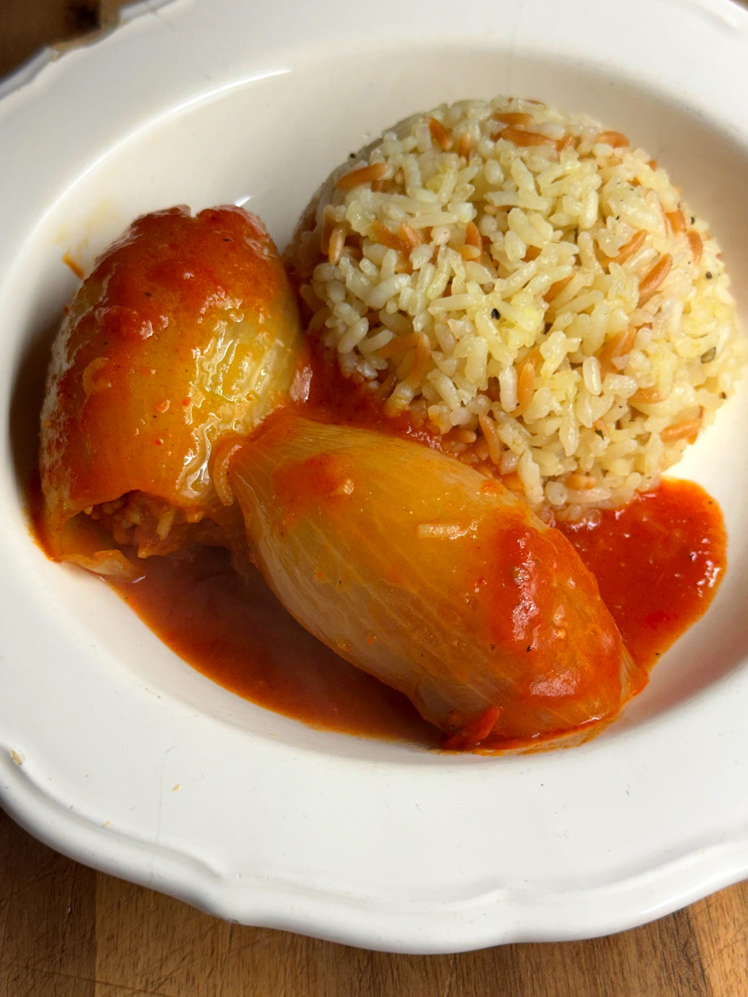 This old-fashioned Turkish dish uses onions as a flavourful wrapping paper for meat and rice, simmered in a rich tomato gravy until tender.