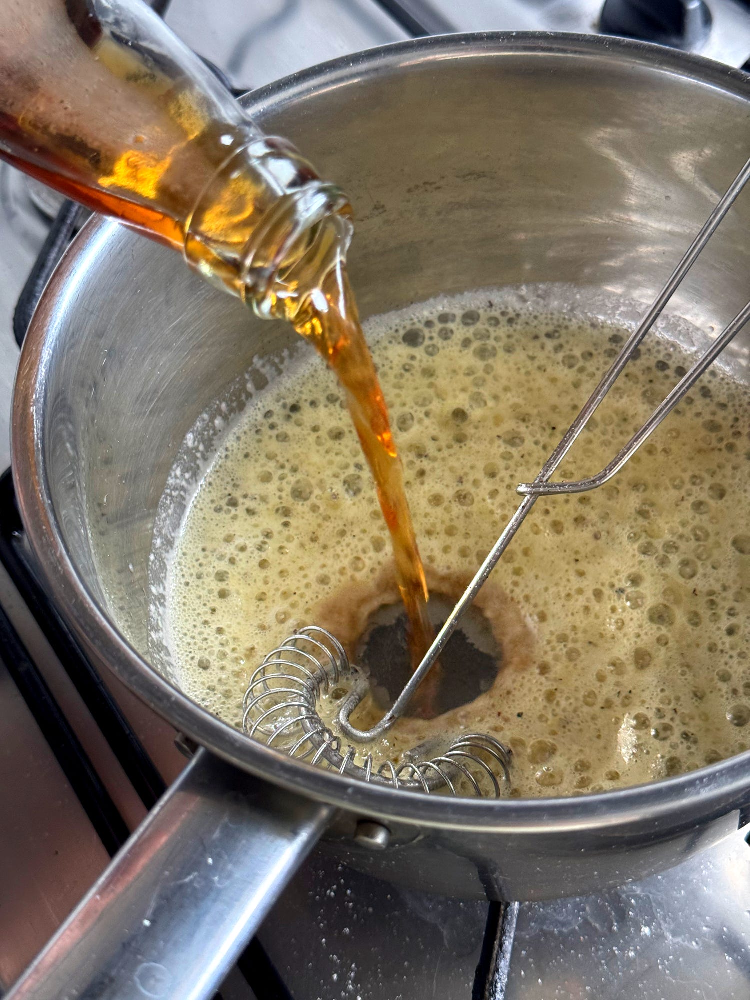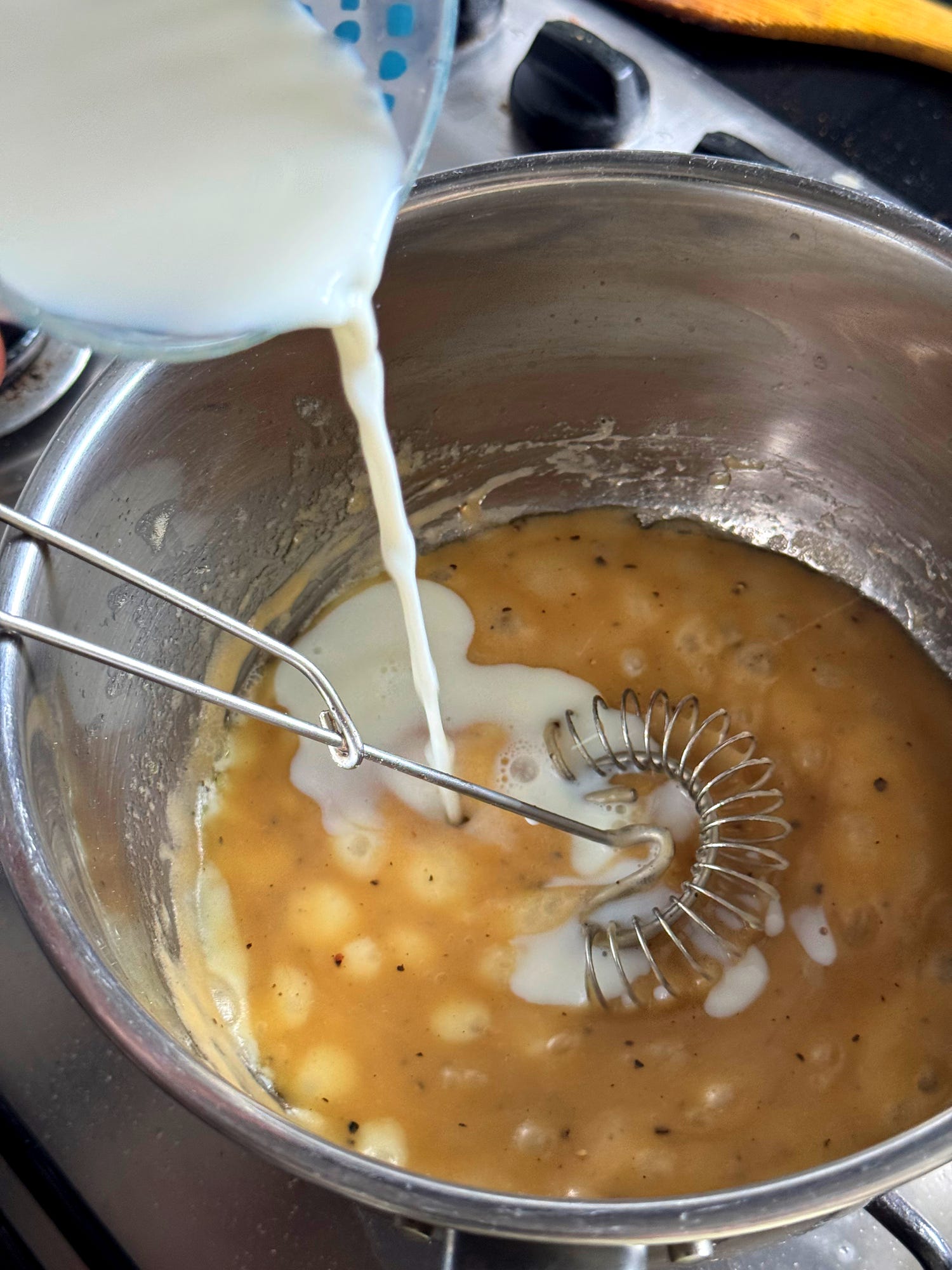 If using, add the 3 tablespoons of brown ale and stir it into the flour-butter paste. Add the 120ml of milk in gradual amounts, stirring it into the paste. It will initially seize and thicken, then eventually loosen to a sauce once the milk is all added.