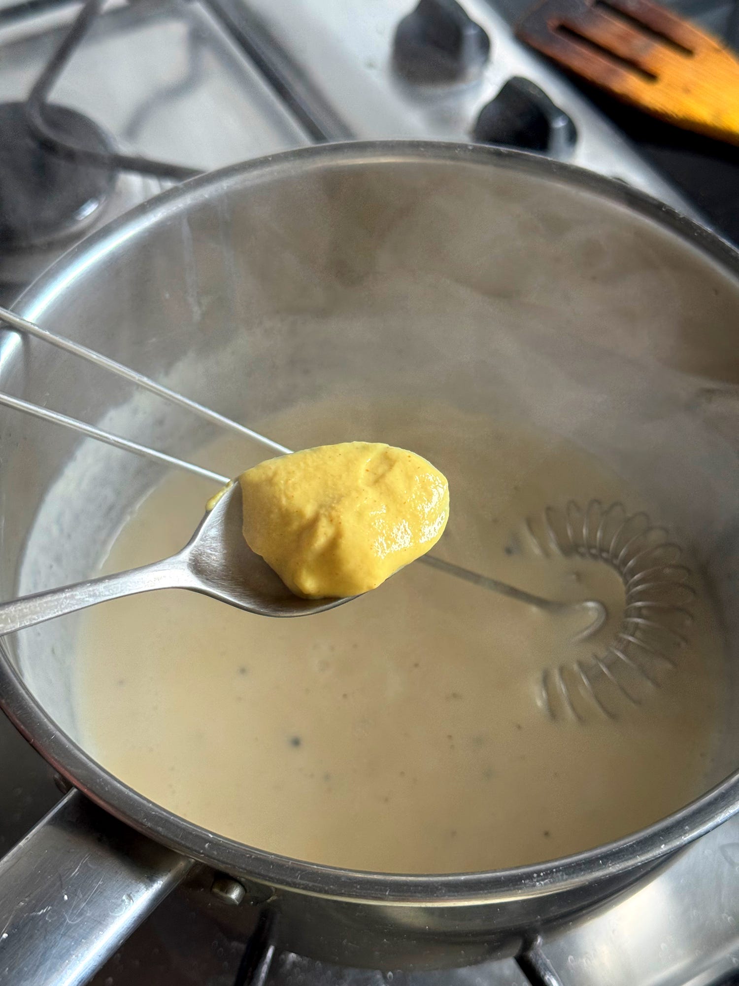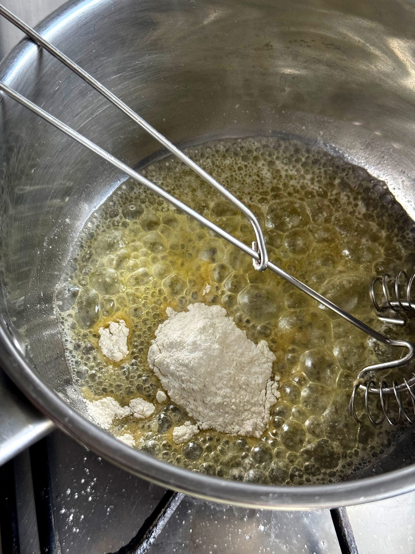 First, let’s make the sauce. Place a saucepan onto medium heat. Add the 25g of butter and allow it to melt until foaming. Add the 1 tablespoon + 1 tsp of plain flour and mix it into the butter. Allow to fry for 30 seconds to form a paste.