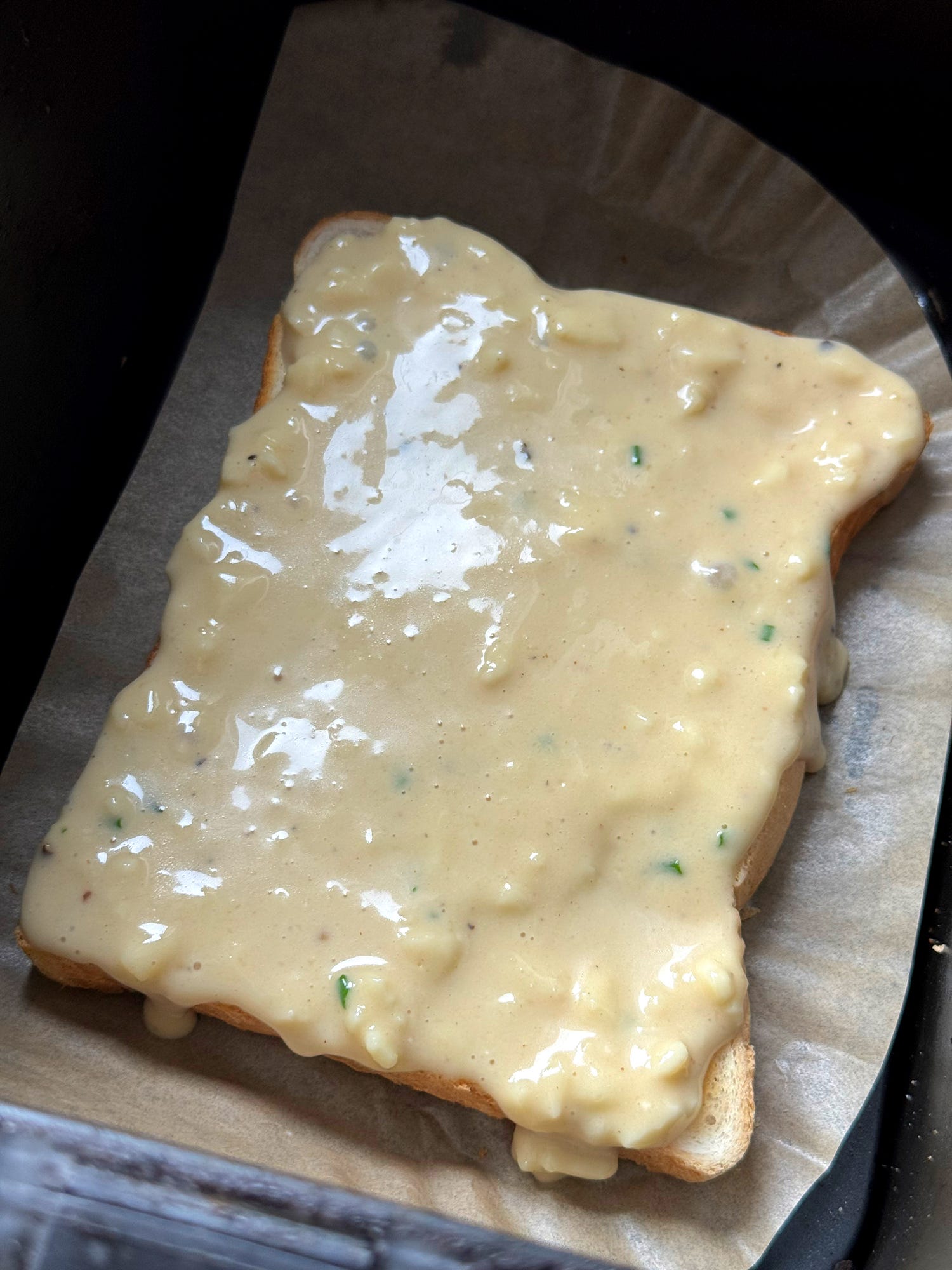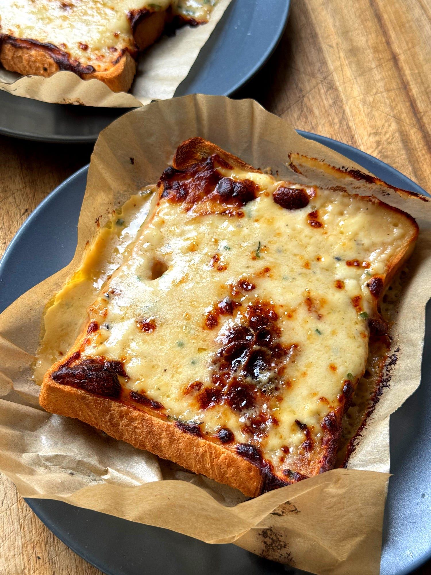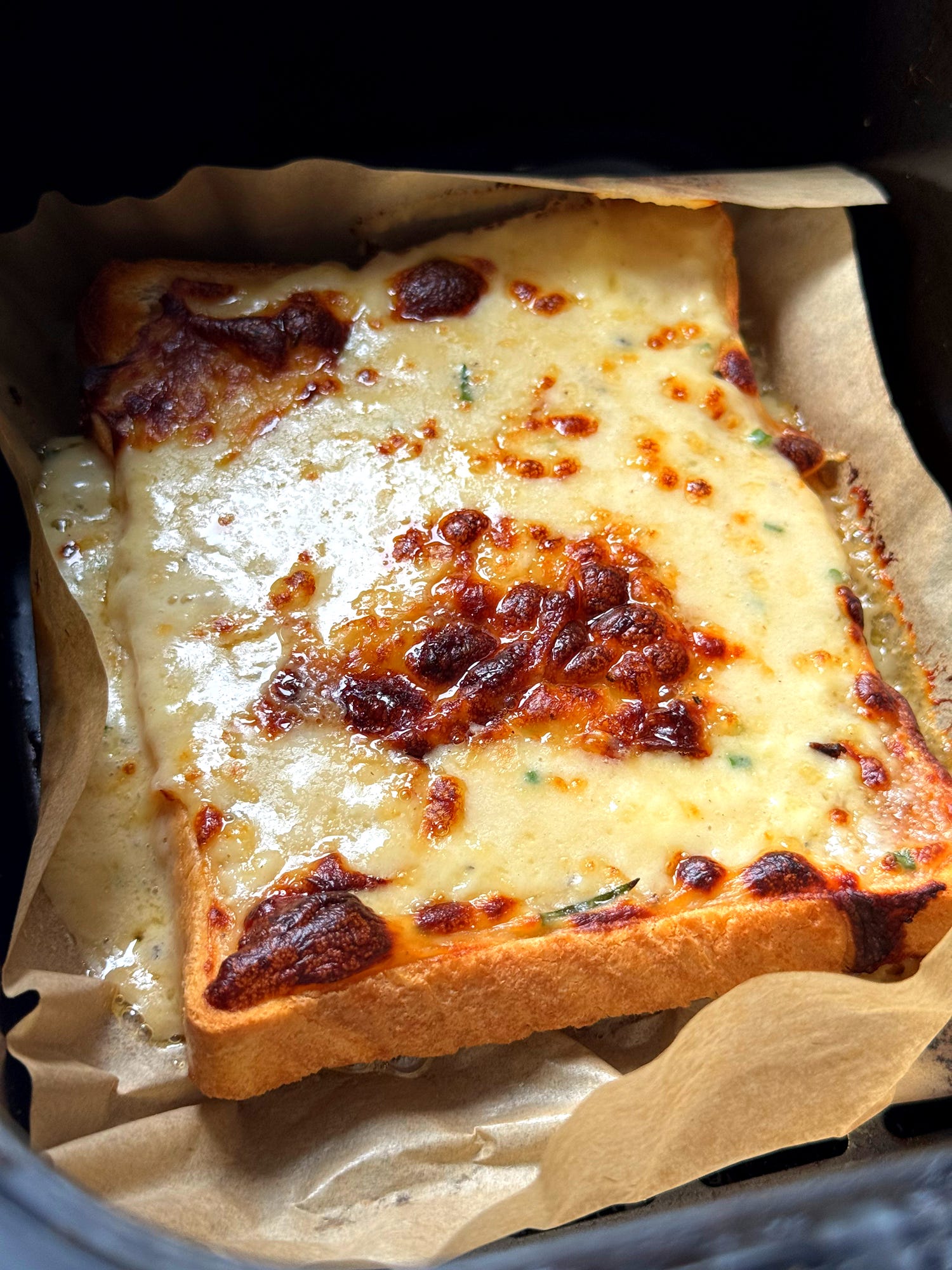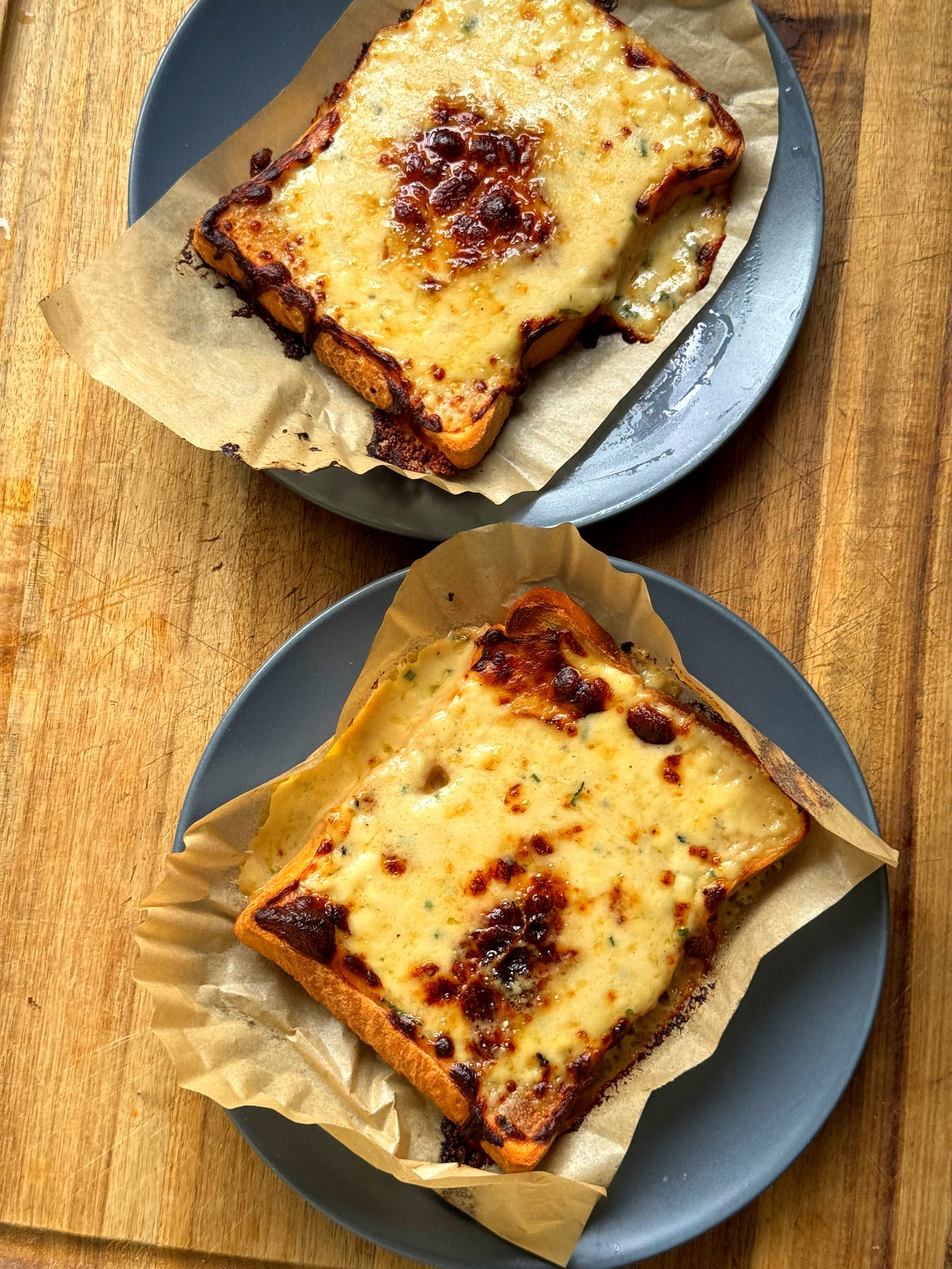 Transfer the toasts to a hot grill/broiler. Alternatively, place them into an air-fryer or oven at 200C/400F and cook/grill them for 5 minutes until bubbling and browned in places.