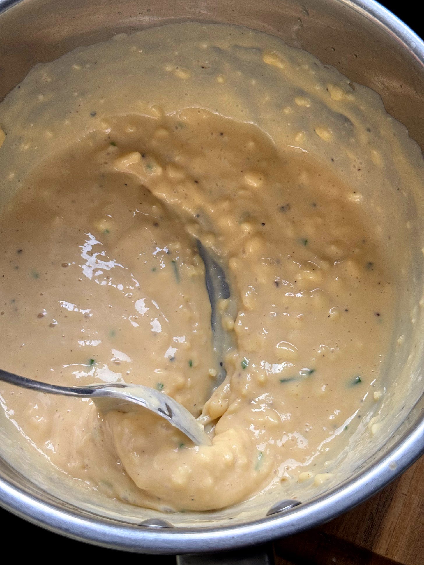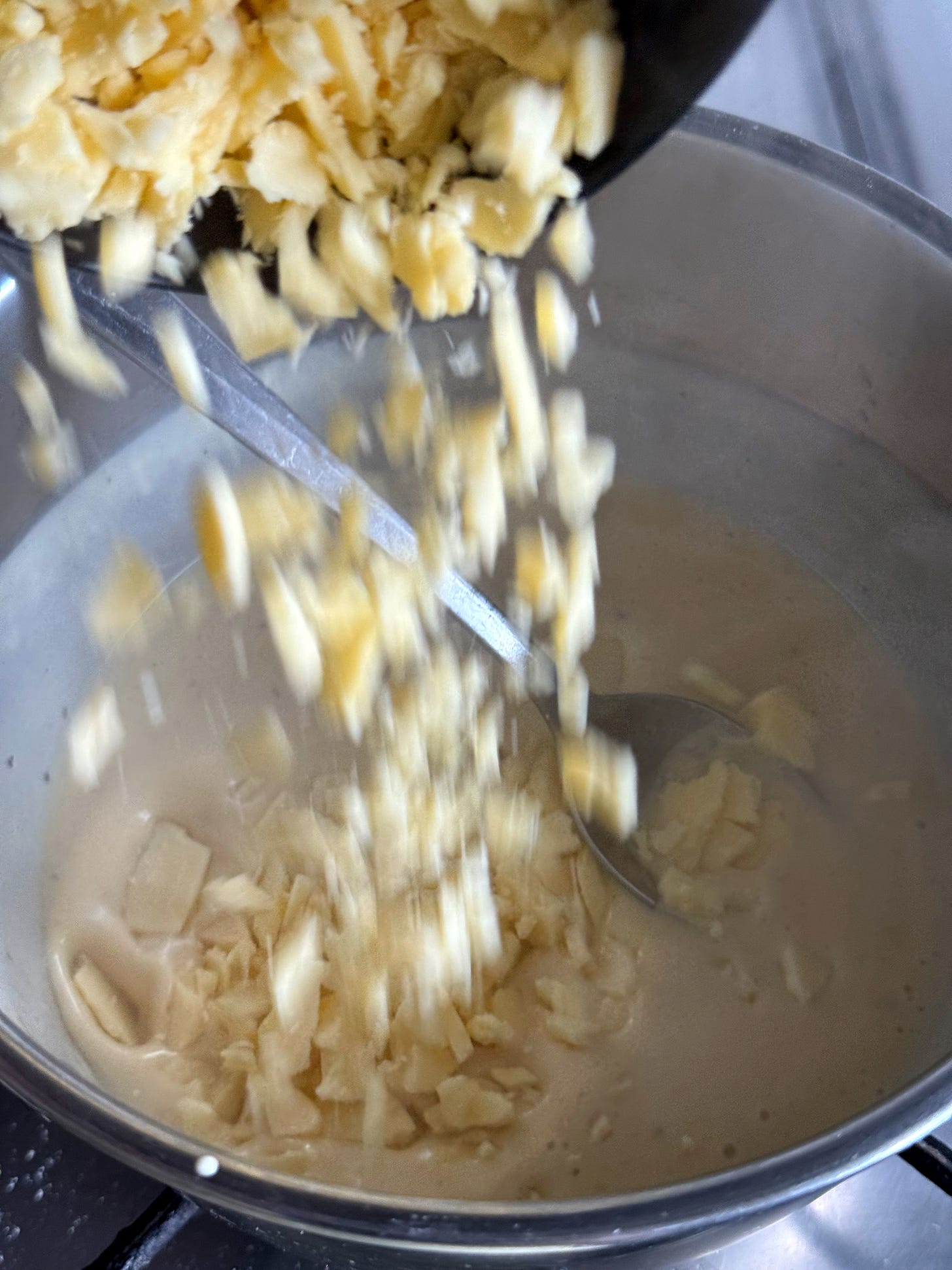 Turn off heat and remove the pan from the stovetop. Add the 80g grated cheddar cheese and the 1 tsp of chopped chives, if using. Stir together until the cheese has mostly melted. Lumps of cheese will remain - this is normal.